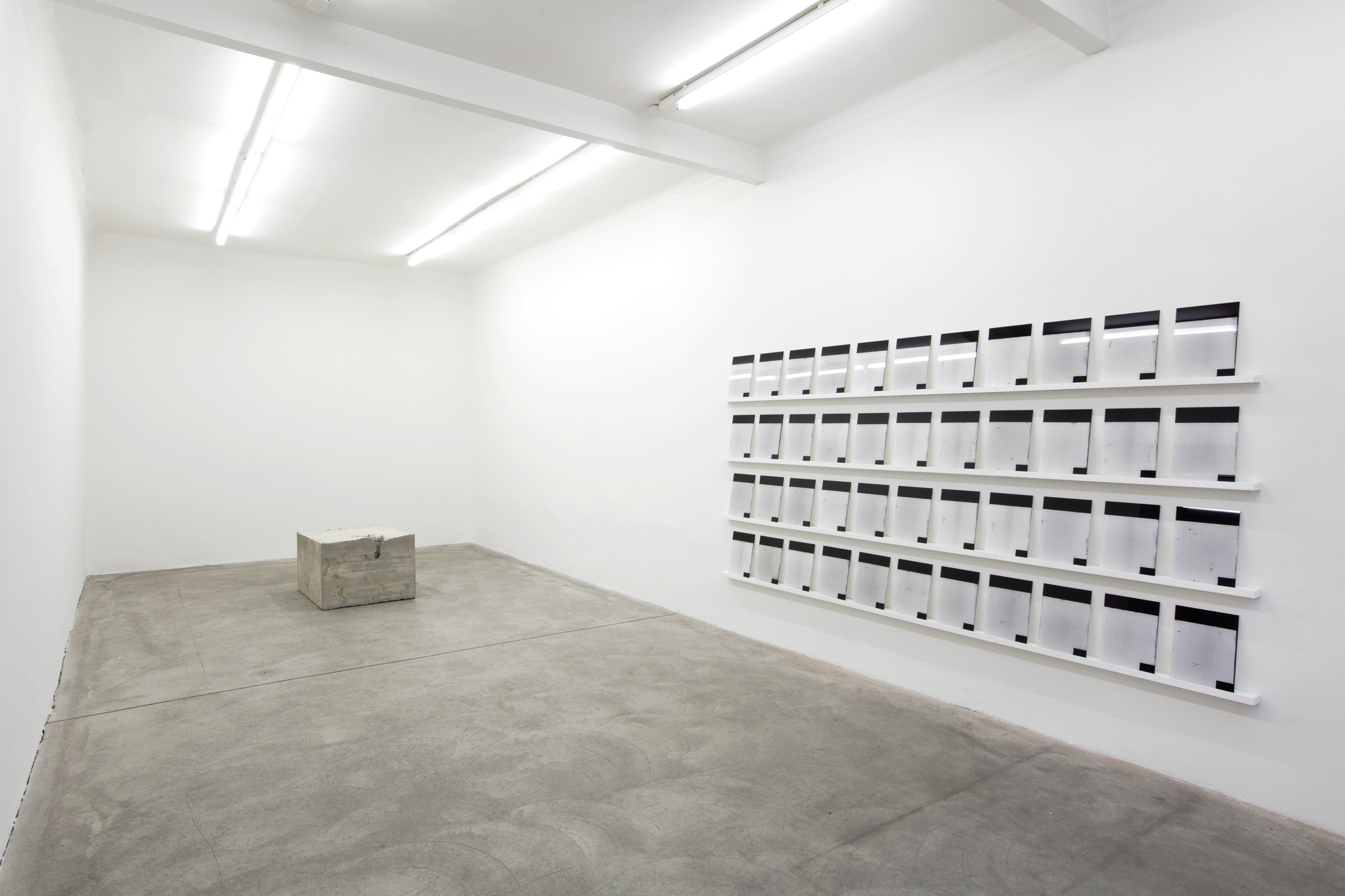 Ryan Gander, Come on! Think!, 44 photographic prints face mounted onto perspex, wooden shelves, 330 × 168 × 10 cm, 2011