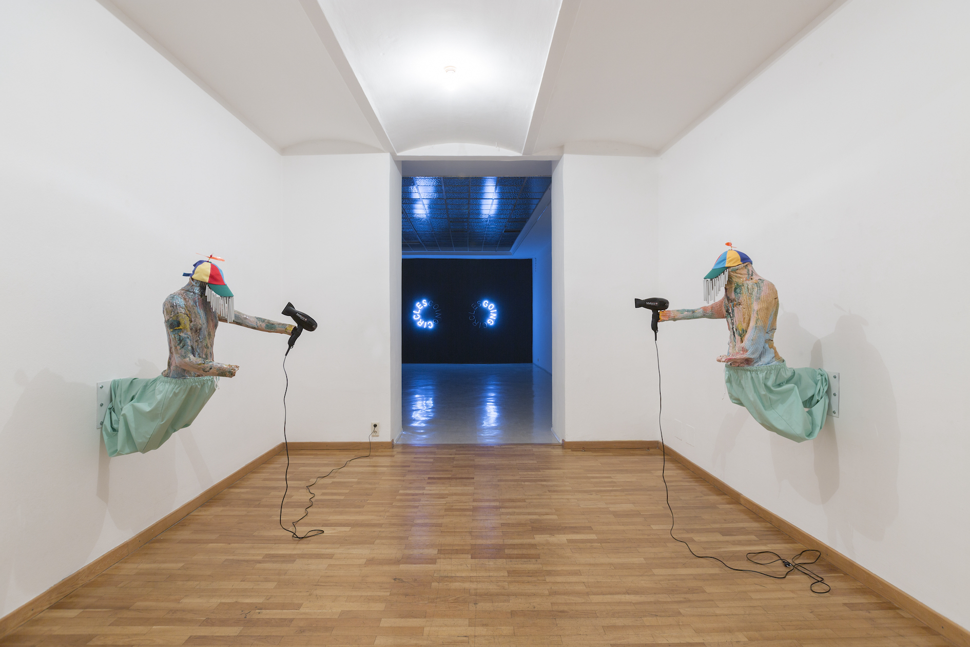 Kris Lemsalu, I will be seven when we meet in Heaven, 2016, ceramics, metal, textile, hair dryers, dimensions variable