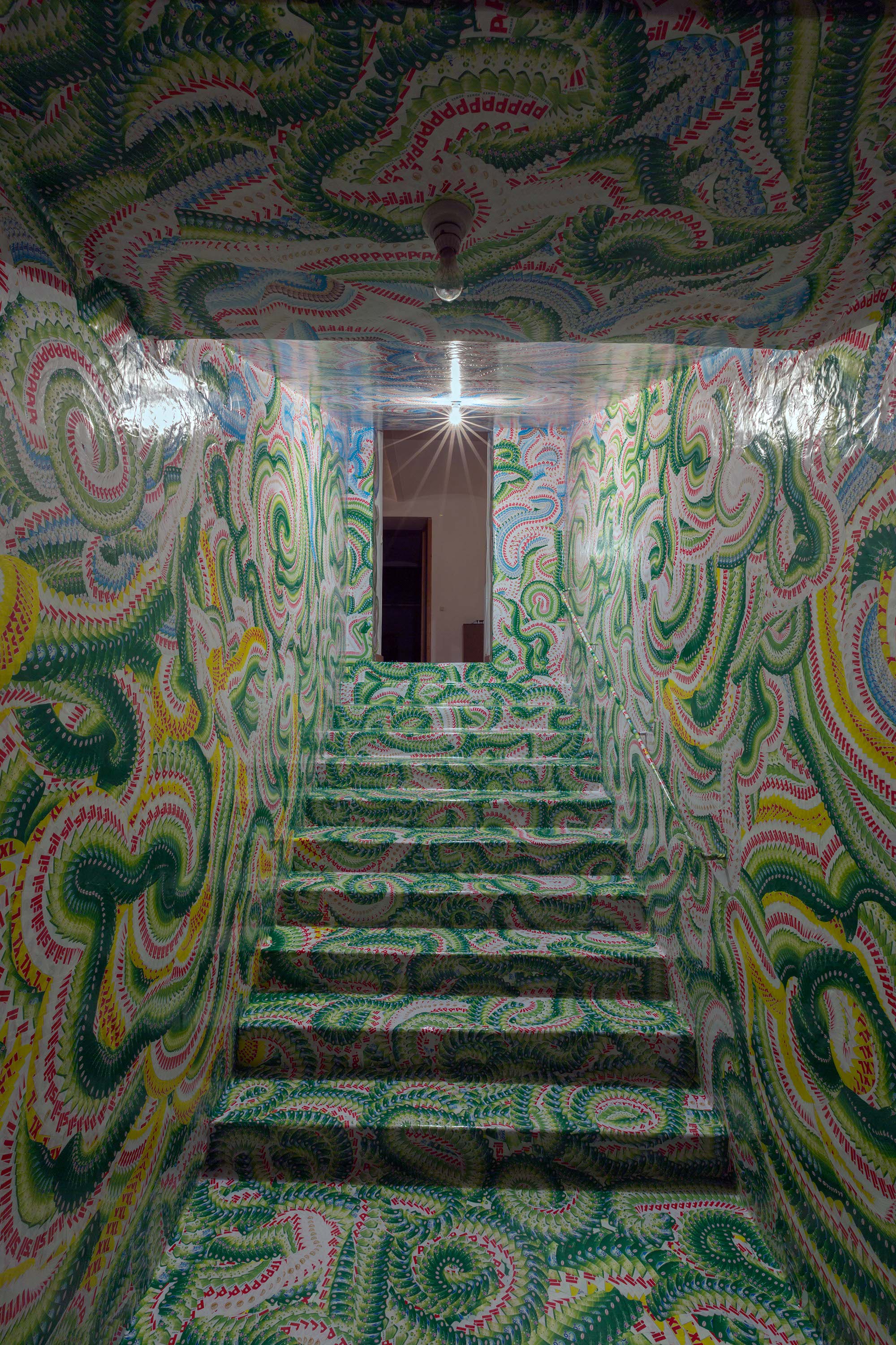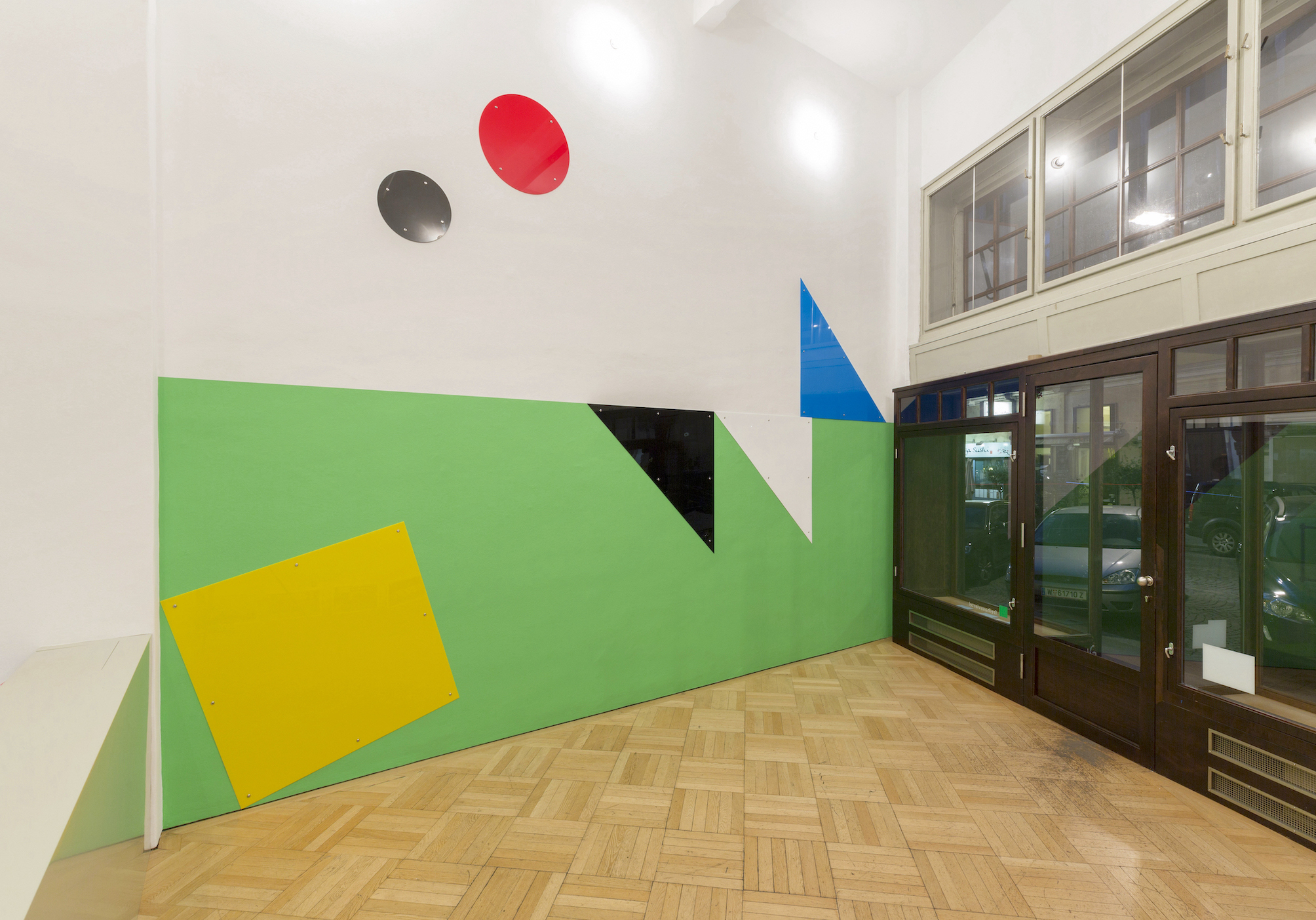 Gerwald Rockenschaub, W/17_2018, wall painting, acryl glass, metal screws, metal washers, 530 x 560 cm, exhibition view Vienna Transit