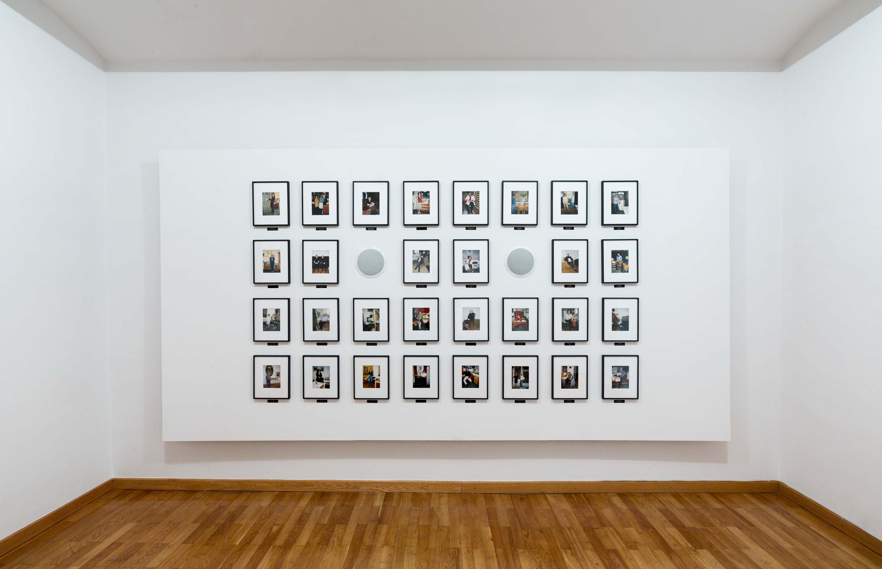 Christian P. Müller, Eine Welt für sich, 1999 - 2018, set of 30 photographs, speakers, aluminium plates passpartout, 30 x 24 cm, framed 31 x 25 cm each, exhibition view Vienna Transit