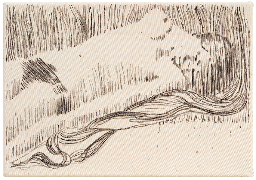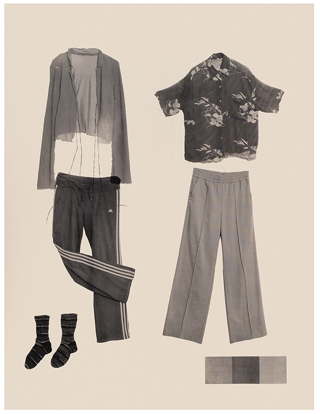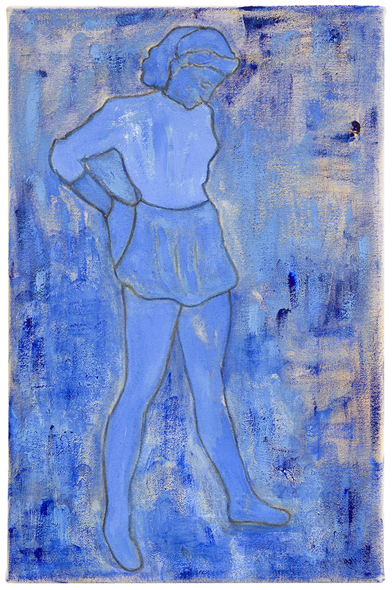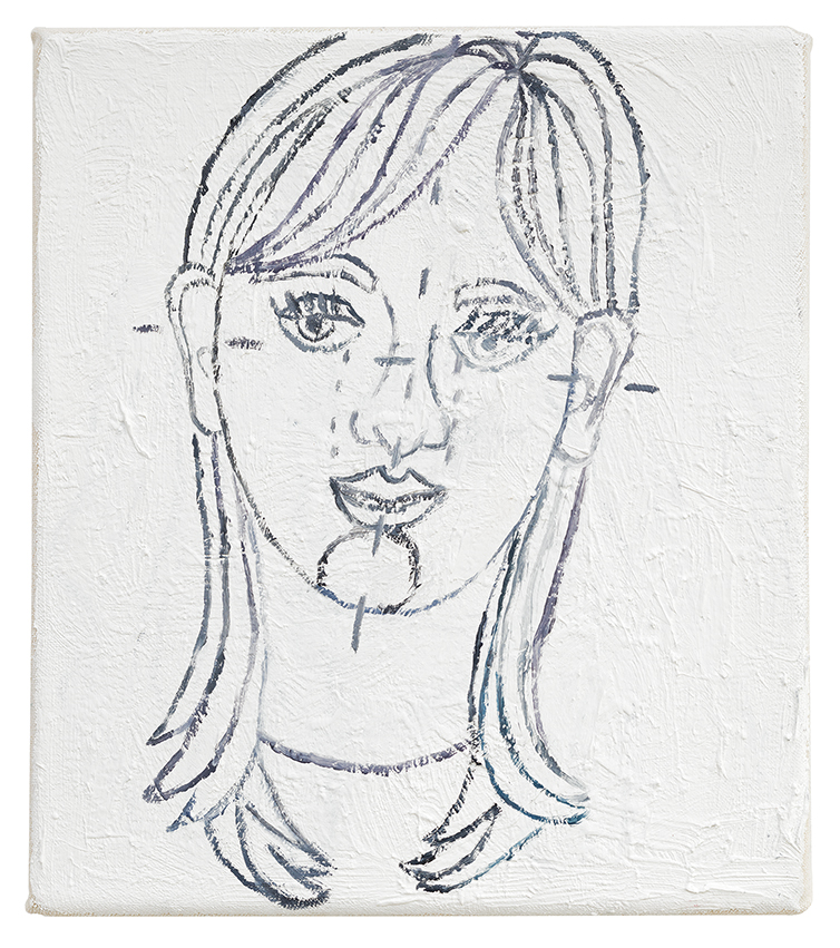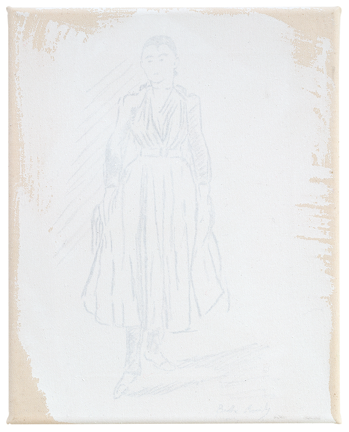 In addition to a showcase dedicated to O’Doherty, we are presenting works on canvas by two contemporary women artists: Mia Sanchez and Gritli Faulhaber. Sanchez addresses clothes as an expression of identity in large silkscreens on untreated canvases. She photographs each item of clothing individually, arranging the outfits assembled on the canvases as part of the printing process. Sanchez does not present the clothes of one person; instead, she addresses codes that convey a standardization and a sense of belonging, investigating how these codes are altered by the identical resolution of the images and the monochromatic print. The canvases display neutralized sample collections and cannot be assigned to certain groups, because they are defined by a common style (color, material, cut, use). Sanchez is interested in the figure of the consumer as well as the methods of how individuals can empower themselves in the daily life of existing societal structures. Faulhaber, on the other hand, calls herself an artist who researches painting as a métier and who acts as a painter. She reacts to the primarily male-dominated history of painting with strategies of appropriating pictures by women artists, addressing close relationships, while transforming and reevaluating traditional subjects. We are presenting a new group of Faulhaber’s small portraits based on pictures of women made by women artists. Each of her pictures is clearly contemporary and possibly a self-portrait. She bases her reproductions of the historical works on representations in her digital archive, so as to re-experience, understand, and revive these in a painterly and emotional sense. One quality of her works is that she leaves the picture ground that she sometimes treats with white oil paint visible in parts. These patches remind us of the materiality of painting but can also be an expression of an unfinished, deliberately open form. Although, like Sanchez, Faulhaber addresses questions of belonging, in her case this is in the social and economic context in which she lives and works as an artist.