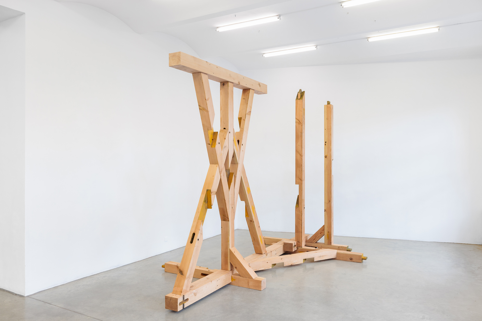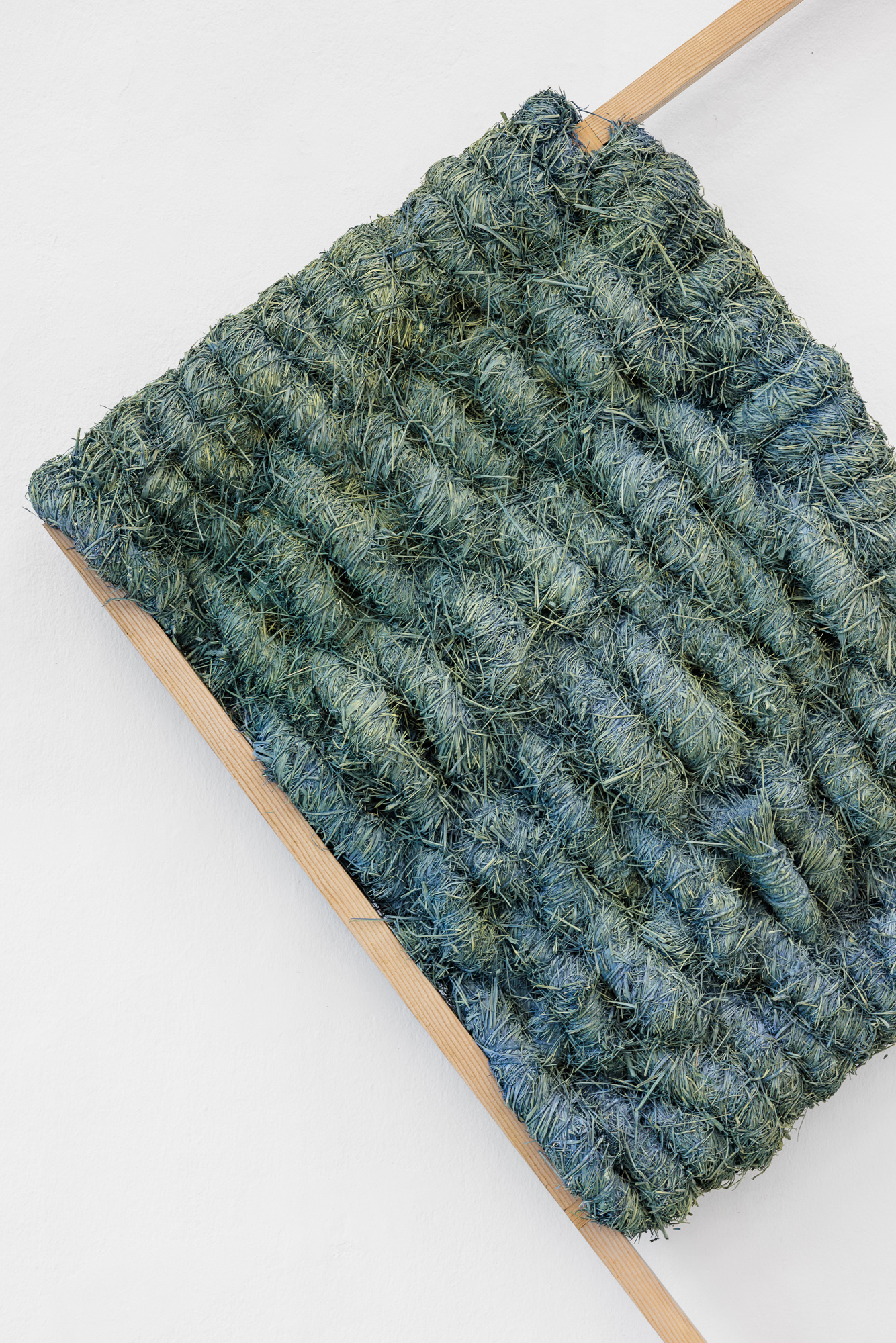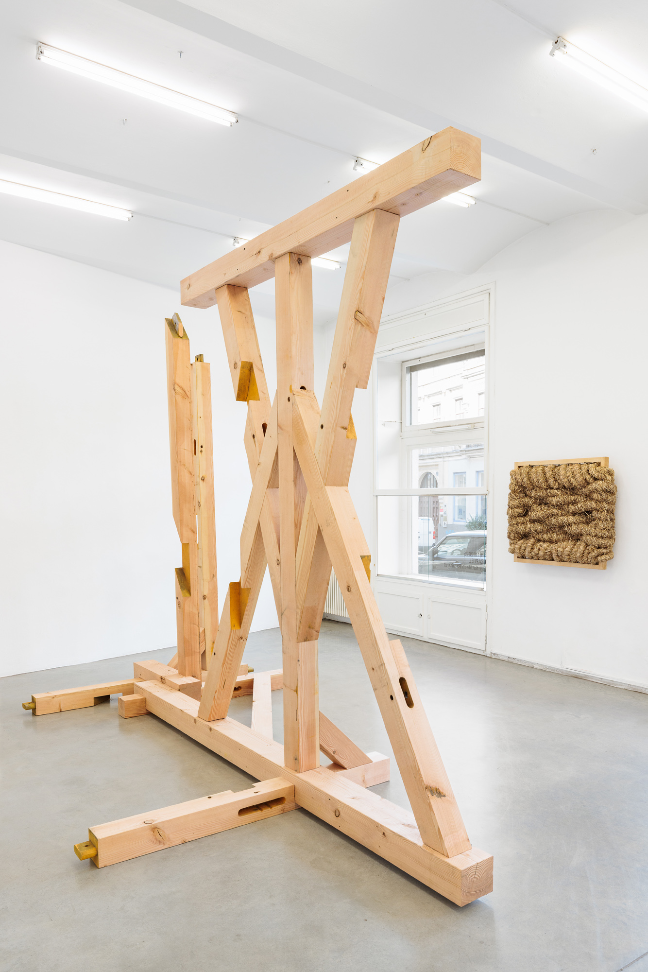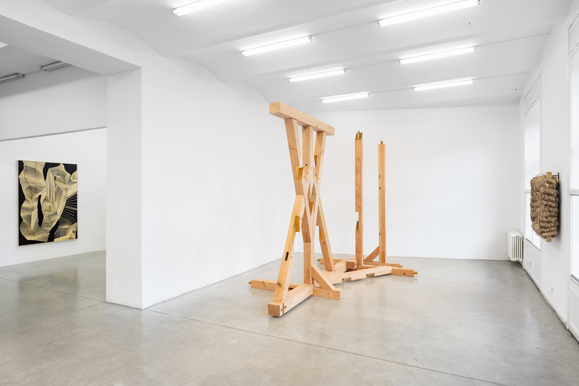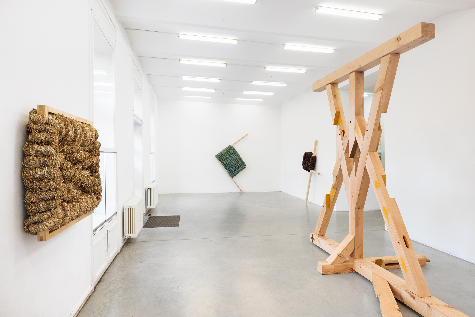 Olaf Holzapfel’s sculptural Half-timbered works were created after 2010, and extend from small models up to life-size realisations in the middle of nature. Likewise, they reflect the exhibitedness of their own content. Art can be constructed and built like a house, and for the erection of his large half-timbered works, this work is carried out not by art handlers but, logically, by carpenters. The integration of specific motifs and figures of German half-timbered constructions, as they are primarily found in Central Germany, represents the artist’s interest in the connection between technique and image. These pictorial signs of houses in the form of visible half-timbered constructions are media before media. They circulate in woven forms, basic constructions such as trestles, frames, or thresholds, and in their combination of body, object, and sensation, they generate a language that is both – carrier of the image, and the image itself. The Hay Pictures also epitomise this. They are material of the landscape, as well as pictures about the landscape. Concurrently, however, they call into question not nature, but cultural techniques around nature and, thereby, our ideas about nature itself. Therefore, Holzapfel’s works are never romanticising, never a glorified consequence of nature and the integration of amorphous natural structures. The artist always begins his reasoning starting with the line, and all of his fibre-containing materials embody within them this orientation towards the line. In the process, his work alternates between analogue and digital and occupies the space between nature and culture, which are not to be comprehended as opposites. The artist often conceives his designs on the computer, yet in their material-based implementation, practical decisions dominate. He describes these material occurrences as ‘common ground’ between himself as an artist and between producing communities that are oriented towards handicraft. Whether in his collaborations with the weavers of the South American Wichí or carpenters from all over the world, it is always a question of developing a common, material-based conversation. In this manner, an intercultural and intertextual mise-en-scène arises, an ongoing translation process that sets in motion culturally and chronologically widely separated signs.