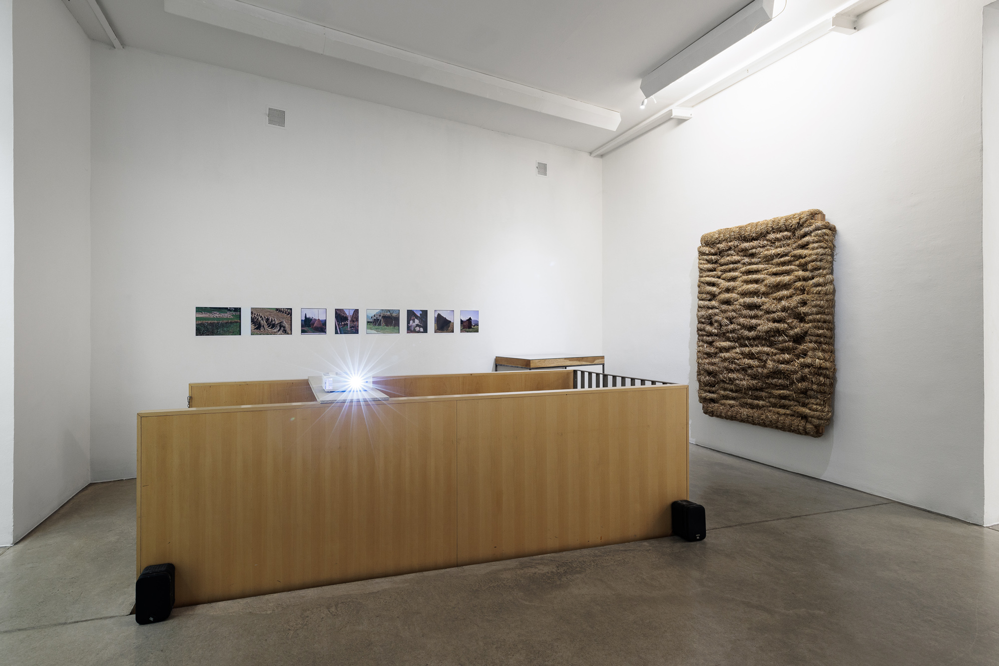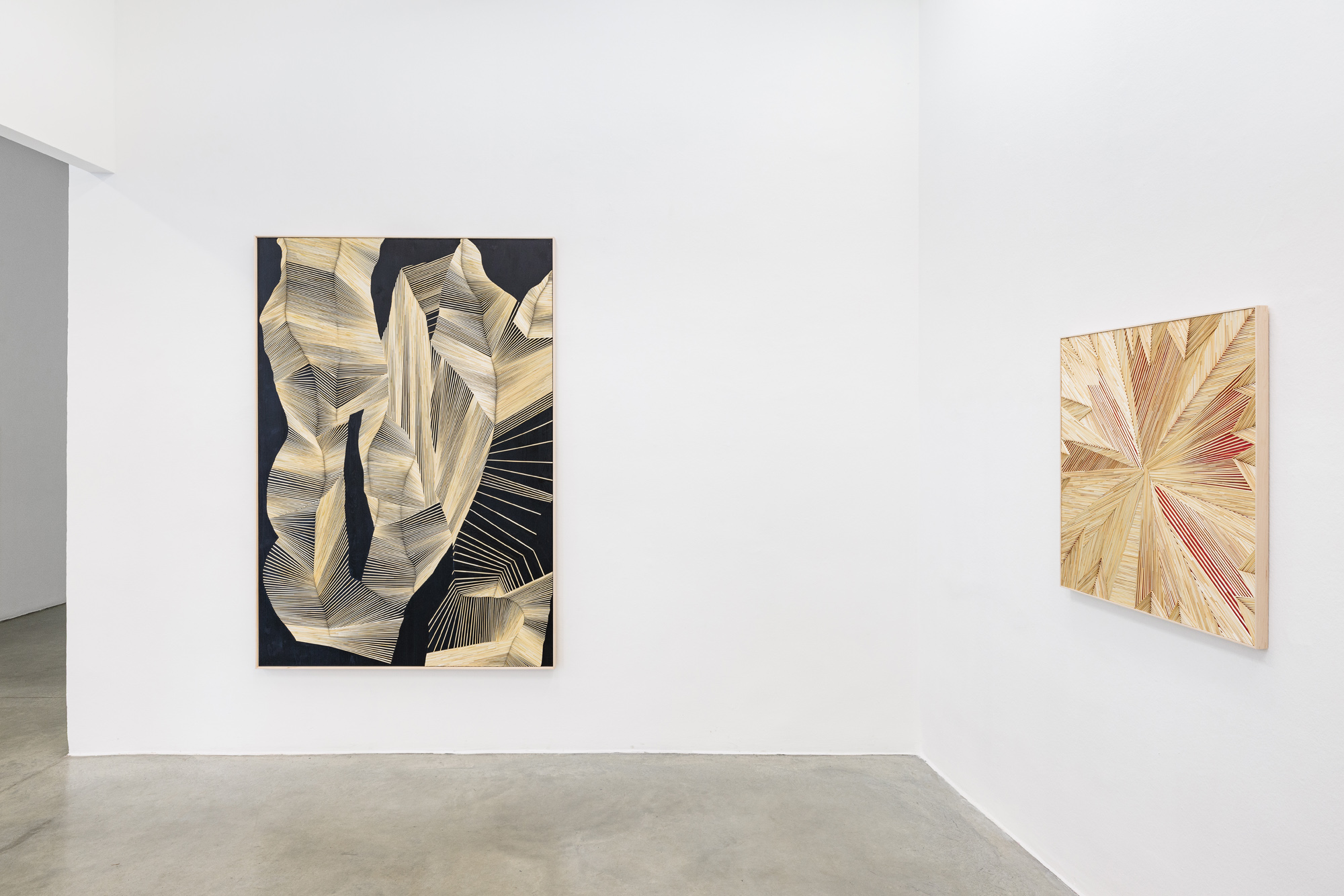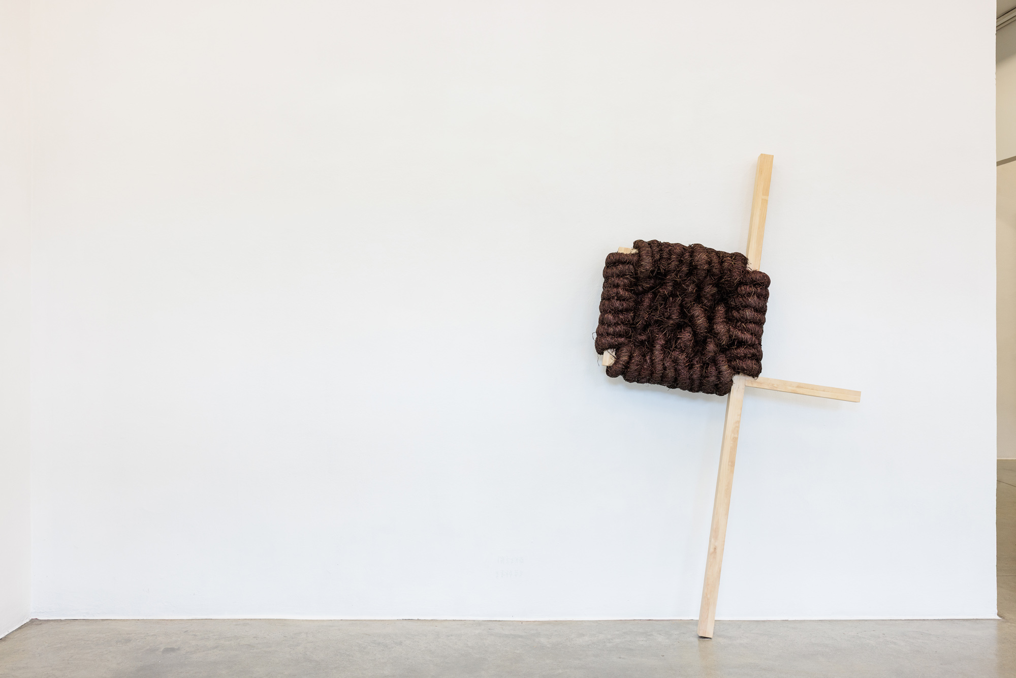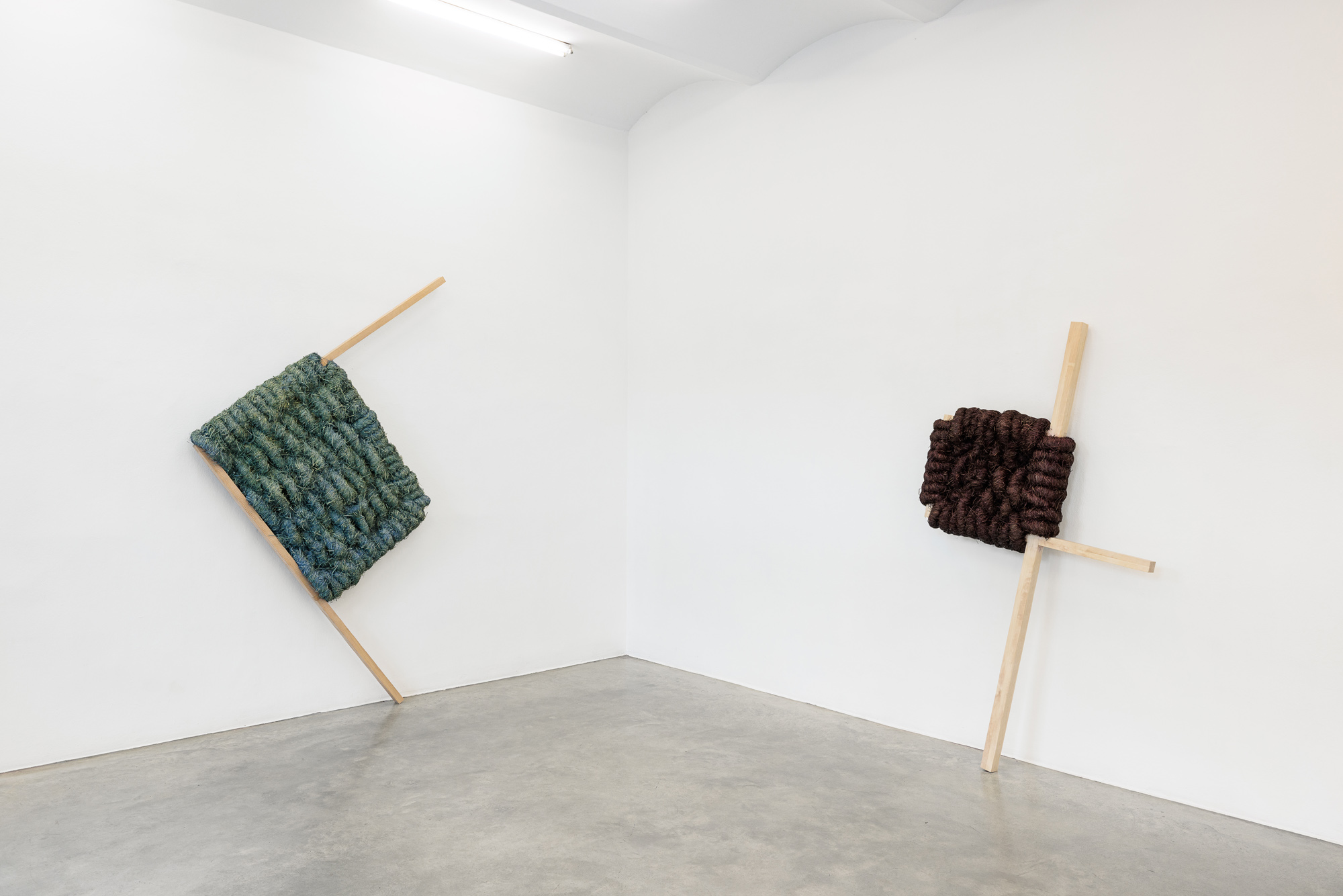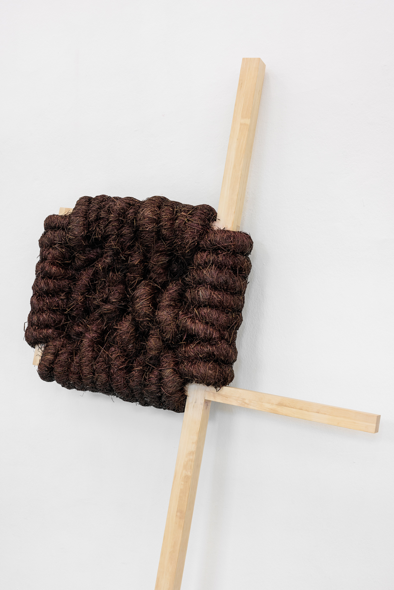 Olaf Holzapfel’s sculptural Half-timbered works were created after 2010, and extend from small models up to life-size realisations in the middle of nature. Likewise, they reflect the exhibitedness of their own content. Art can be constructed and built like a house, and for the erection of his large half-timbered works, this work is carried out not by art handlers but, logically, by carpenters. The integration of specific motifs and figures of German half-timbered constructions, as they are primarily found in Central Germany, represents the artist’s interest in the connection between technique and image. These pictorial signs of houses in the form of visible half-timbered constructions are media before media. They circulate in woven forms, basic constructions such as trestles, frames, or thresholds, and in their combination of body, object, and sensation, they generate a language that is both – carrier of the image, and the image itself. The Hay Pictures also epitomise this. They are material of the landscape, as well as pictures about the landscape. Concurrently, however, they call into question not nature, but cultural techniques around nature and, thereby, our ideas about nature itself. Therefore, Holzapfel’s works are never romanticising, never a glorified consequence of nature and the integration of amorphous natural structures. The artist always begins his reasoning starting with the line, and all of his fibre-containing materials embody within them this orientation towards the line. In the process, his work alternates between analogue and digital and occupies the space between nature and culture, which are not to be comprehended as opposites. The artist often conceives his designs on the computer, yet in their material-based implementation, practical decisions dominate. He describes these material occurrences as ‘common ground’ between himself as an artist and between producing communities that are oriented towards handicraft. Whether in his collaborations with the weavers of the South American Wichí or carpenters from all over the world, it is always a question of developing a common, material-based conversation. In this manner, an intercultural and intertextual mise-en-scène arises, an ongoing translation process that sets in motion culturally and chronologically widely separated signs.