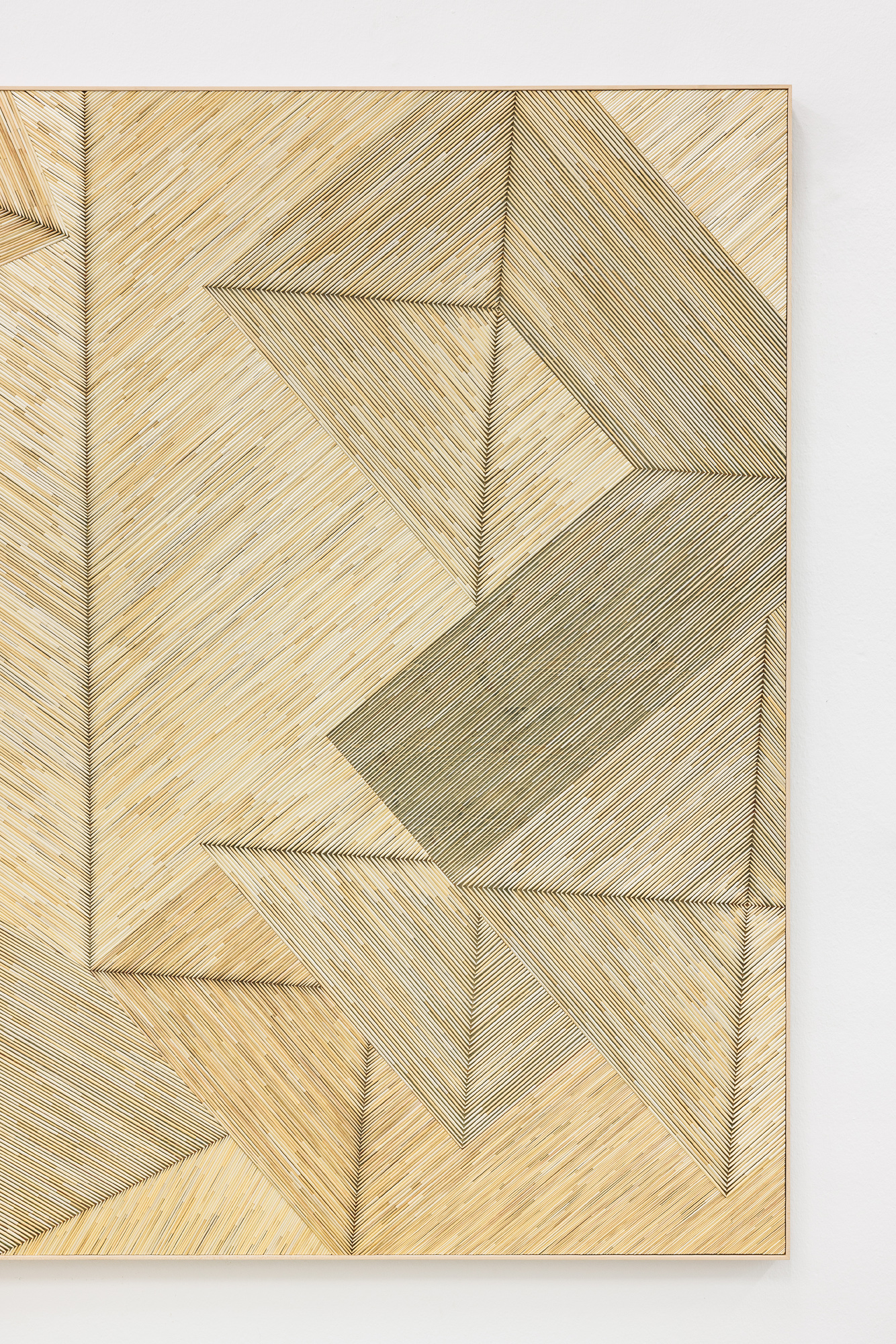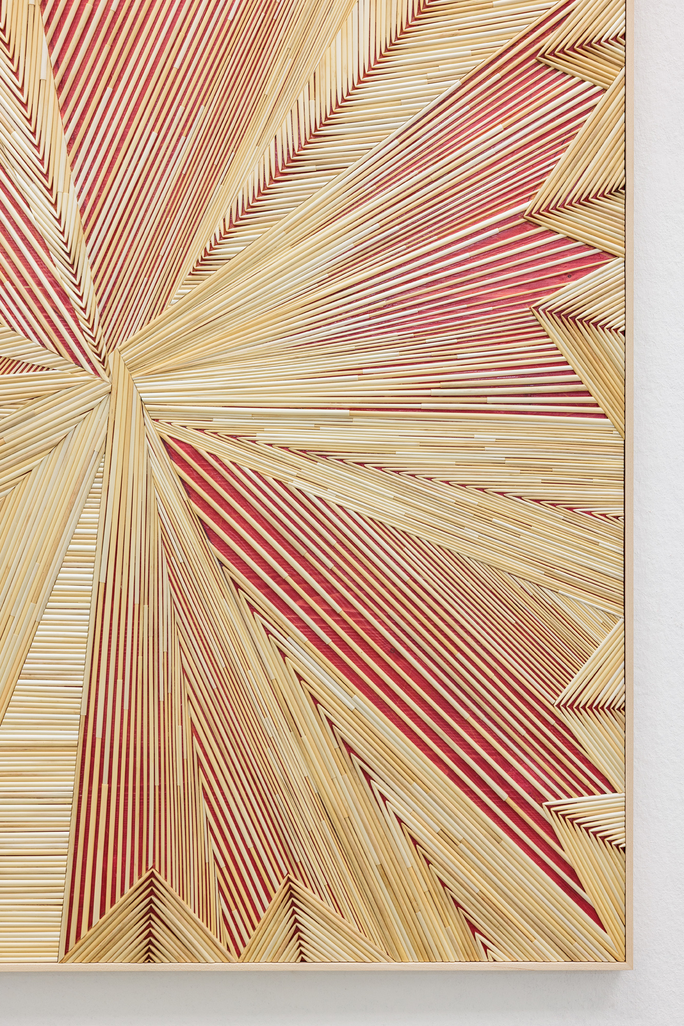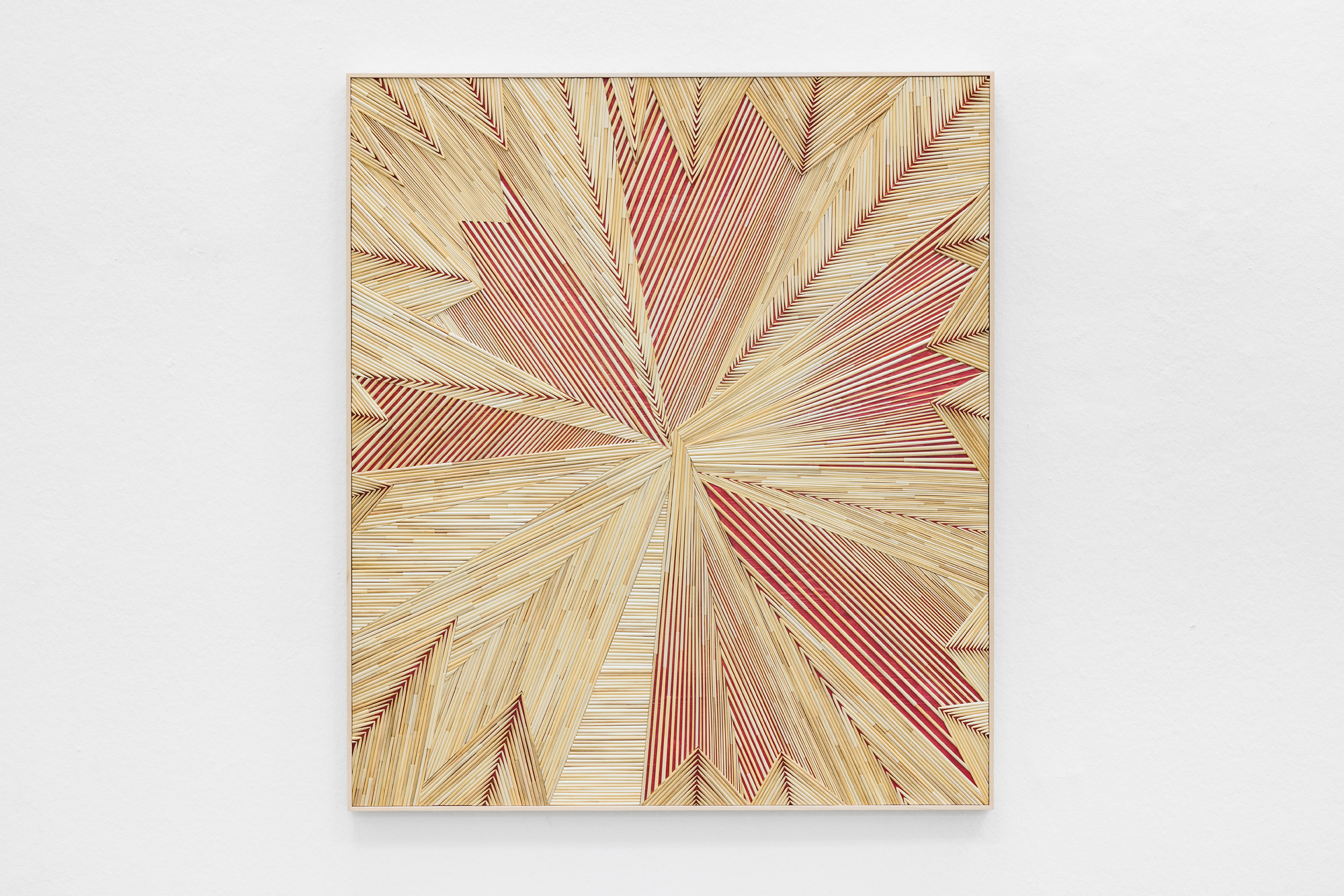 The analysis and processing of the fragmentary appears in highly diverse forms and media in the works of Olaf Holzapfel. His method of reasoning and working is always characterised by an urge to critically investigate and dismantle the inherent logic of processes and structures: from his early, today highly topical investigations of breaches in image spaces between computer images and painting, to sculptural spatial images and architectonic constructions made of natural materials in interior and exterior spaces, up to video works which explore highly diverse mental and physical spaces and poetically put them up for negotiation. His circling around the materialities of our physical world always constitutes the foundation, as does a continual questioning of the artificial demarcation between analogue and digital, art and craft, high culture and popular traditions. While doing so, he modifies the familiar characterisation of an object, without, however, erasing its identification, that is, its situatedness within the networks of cultural affiliation and social symbolism. His Straw Pictures are clearly made out of straw, and the stalks constitute the exalted lines of abstract compositions. These compositions can diverge rhythmically, and they can also be strictly geometrically organised. The artist is initially less concerned with the symbolism of straw or the configuration of a pure surface; he is far more interested in the practical application and what results from it. He consistently takes this probing of the possibilities of application seriously and reevaluates them, creating a material-based space for decisions, which always is central in his artistic practice. As a consequence, the material exhibits itself in his works and thereby creates its own meaning.