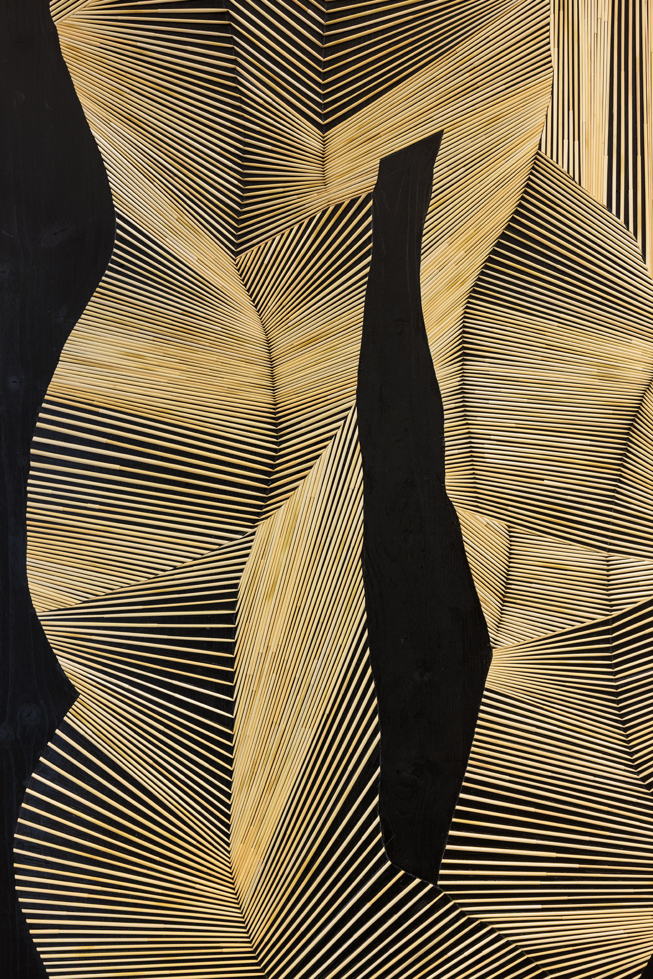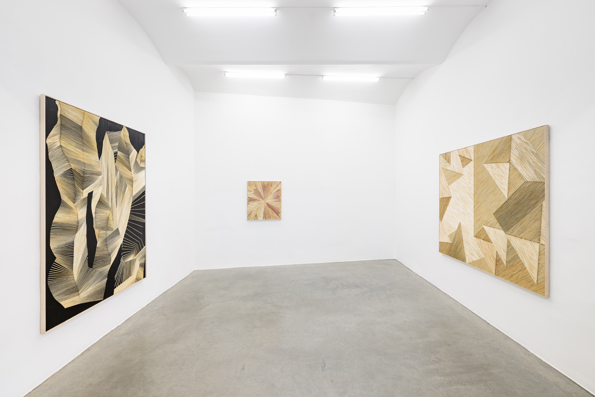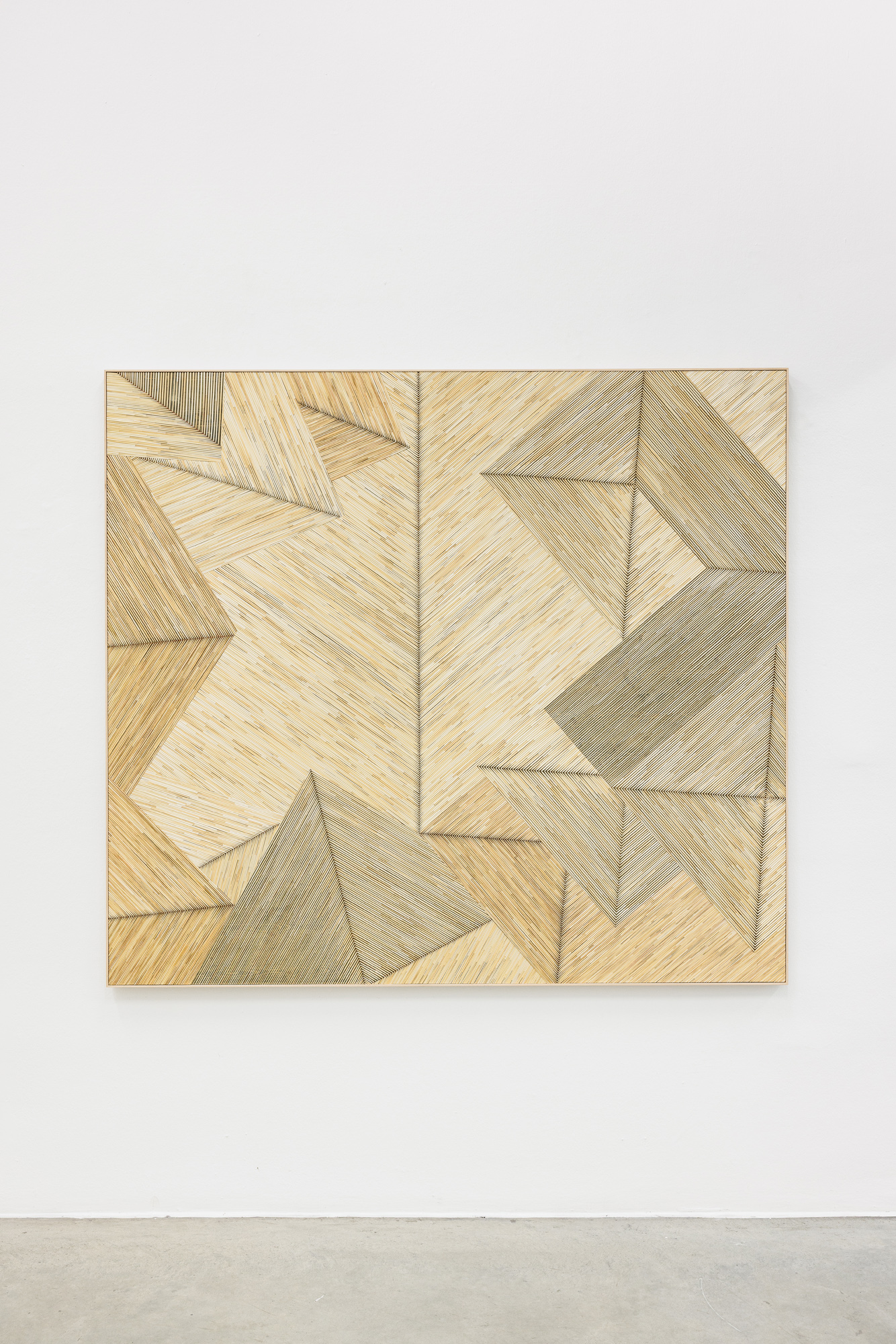 The analysis and processing of the fragmentary appears in highly diverse forms and media in the works of Olaf Holzapfel. His method of reasoning and working is always characterised by an urge to critically investigate and dismantle the inherent logic of processes and structures: from his early, today highly topical investigations of breaches in image spaces between computer images and painting, to sculptural spatial images and architectonic constructions made of natural materials in interior and exterior spaces, up to video works which explore highly diverse mental and physical spaces and poetically put them up for negotiation. His circling around the materialities of our physical world always constitutes the foundation, as does a continual questioning of the artificial demarcation between analogue and digital, art and craft, high culture and popular traditions. While doing so, he modifies the familiar characterisation of an object, without, however, erasing its identification, that is, its situatedness within the networks of cultural affiliation and social symbolism. His Straw Pictures are clearly made out of straw, and the stalks constitute the exalted lines of abstract compositions. These compositions can diverge rhythmically, and they can also be strictly geometrically organised. The artist is initially less concerned with the symbolism of straw or the configuration of a pure surface; he is far more interested in the practical application and what results from it. He consistently takes this probing of the possibilities of application seriously and reevaluates them, creating a material-based space for decisions, which always is central in his artistic practice. As a consequence, the material exhibits itself in his works and thereby creates its own meaning.