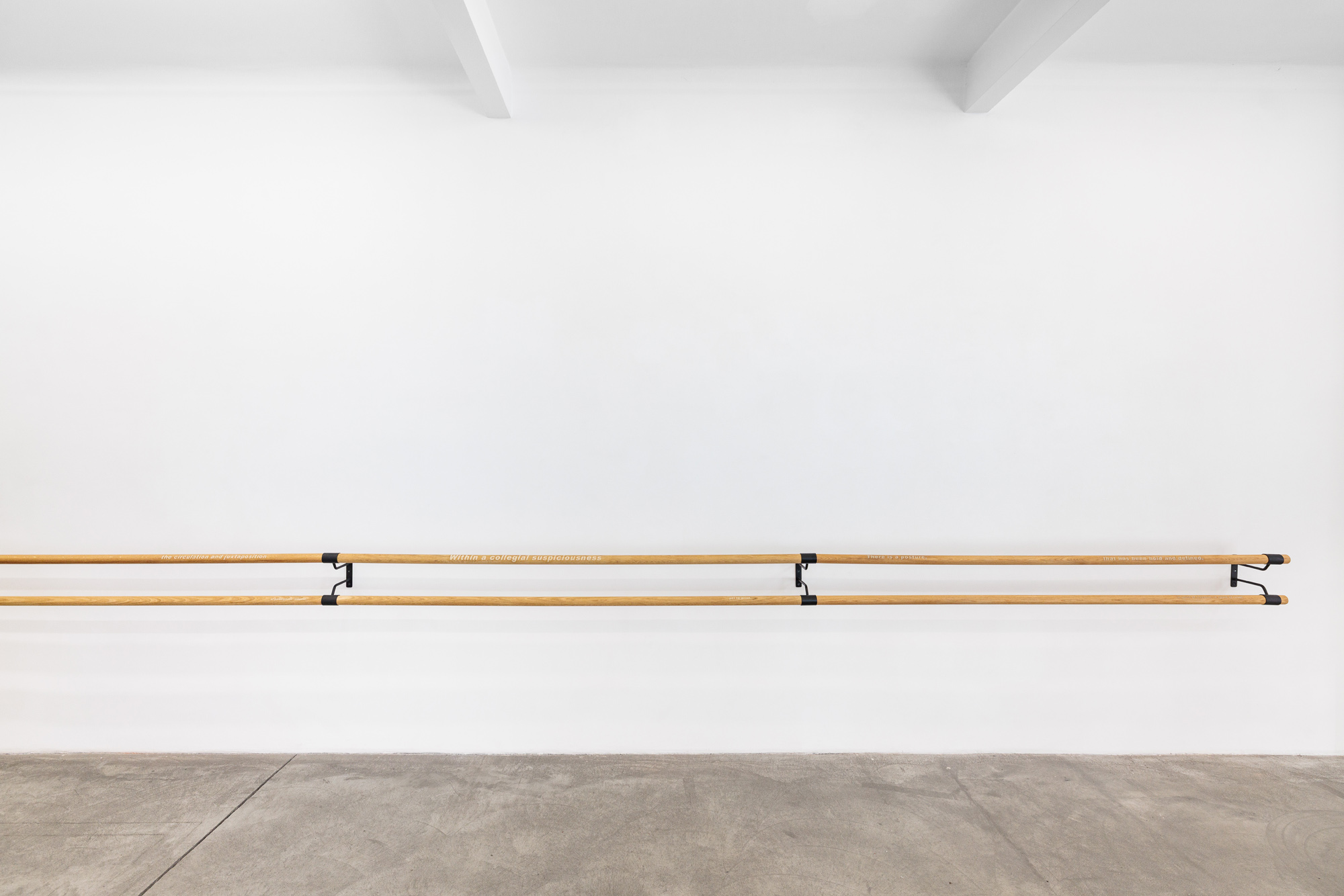 A series of ballet bars constitute another kind of scene for contemplation and observation. Trained as a classical ballerina, Anna K.E. has extensive experience of self-reflection and self-discipline. The barres are inscribed with text fragments from Profound Approach Easy Outcome — written-down thought patterns from the time creating the video work Peripheral Monday. The engraved texts are filled with smooth marzipan that over time has hardened when the sugar in it has been exposed to air humidity. Marzipan’s moldability makes it suitable for creating decorative shapes and figures. The idea of the ‘moldable’ body for classical dancers, how rigorous training and dedication can significantly alter their physique, is close at hand. The text fragments have no given order and can be read and combined freely.