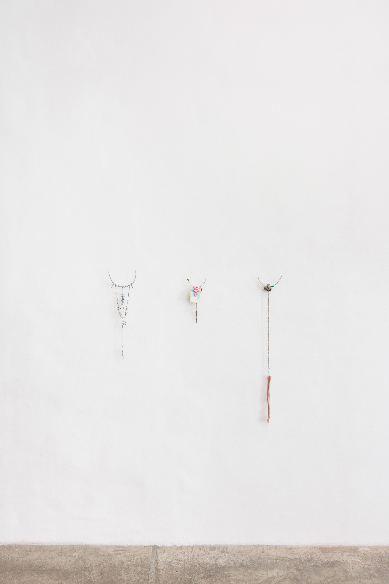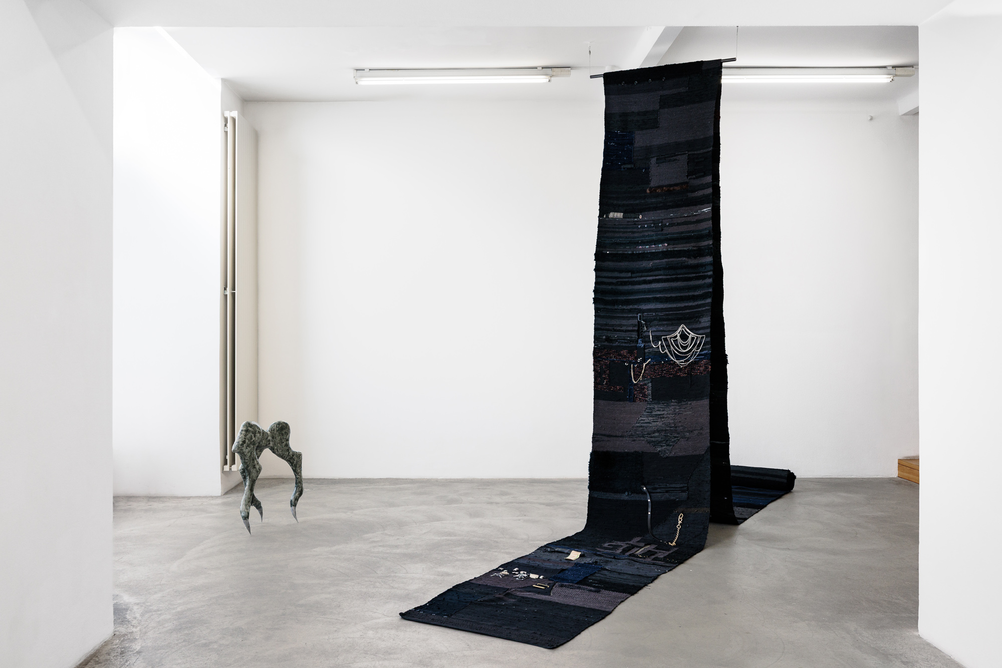The works of Anna K.E. focus on the very act of looking—through gazing and observing she gains control over her self-image. Linnéa Sjöberg’s (b. 1983) approach might appear more drastic but with a similar goal, to resist the definition of others and to be forced to fit in. In extensive performative projects, Sjöberg has lived art through vastly different personas. The here presented works stem from times when she transformed herself into first a businesswoman and then a tattoo artist. As a businesswoman she was wearing pencil skirts, pearl earrings, and speaking in a soft voice. She stayed in character around the clock for one and a half years, of which almost six months in Vienna (2009). In the years following the performance, Sjöberg created a series of works out of the clothes and accessories she had worn. These works are a way of preserving and isolating an identity Linnéa Sjöberg built but then shed. As a self-taught tattoo artist, she ran a ‘mobile amateur parlor’ named Salong Flyttkartong (transl. Salon Moving Box). It toured haphazardly for over two years (2012–2014), a few times also to Vienna, and through a series of open performances developed into an intricate participatory artwork. This process created its’ own aesthetics, a unique space in the field between the inherent permanence of the tattoo medium and the spontaneity of the performance act. Traces left from this period are found on the artist’s own skin and on all those who chose to get tattooed by her, as well as collages made of the salon’s mobile scenography. Four Generations of Darkness (2016) is a 14-meter-long textile tapestry made from fabrics and other materials from Linnéa Sjöberg's family home. It features traces and the history of several generations of her family, woven together like the continuously inherited and altered genetics, serving as the foundation for a person’s further development. In a series of free-standing works, found objects are strung on bra underwires. These Portraits of Unknown Women (2018 – ongoing) are imaginations of sorts, and the artist’s further exploration of identity and the self.