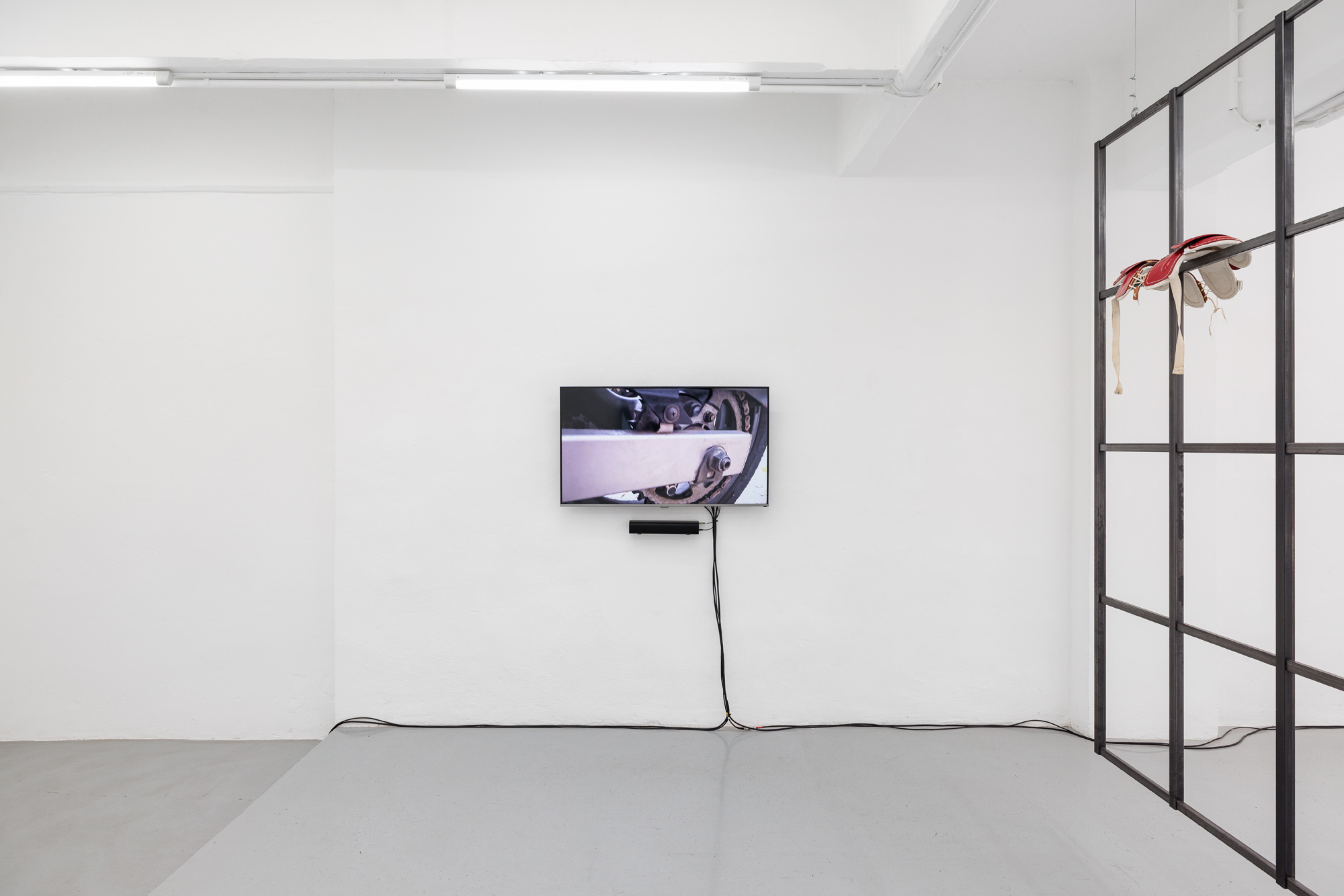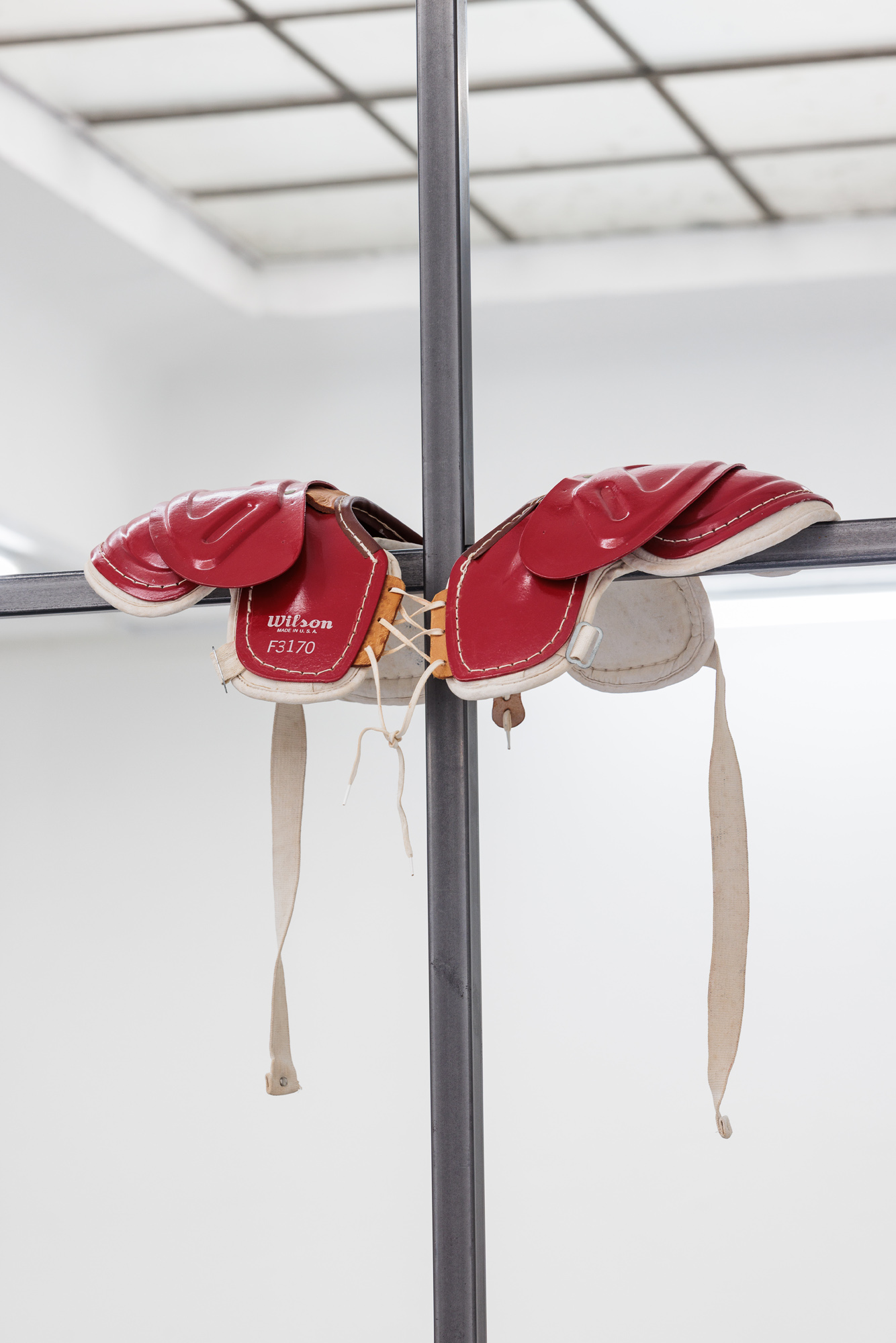 Studio (2024) is a 1:1 replica of the only window in Raso’s former studio in Basel. The pair of 1950s Wilson shoulder pads that the artist added there may catch for the eye, an unusual focal point positioned above the classic eye-level on the grid of panes, a visible resistance in the supposed transparency of the absent glass. Made of animal by-products discarded by slaughterhouses, it may as well be an eerie signal to a missing (as much as ever-changing) body, just as the window is in relation to the landscape it frames. The work focuses our attention on the intimate, highly charged (in both bodily and psychological terms) experience of looking, and on the material nature of its medium, despite the wet dreams of oculocentrism. Raso’s intervention, vis-à-vis the long tradition of Western artists meditating on windows as being more or less metaphorical tools with which to picture reality, is rooted instead in her work on the immanent exchange of bodies and skins, objects and images, casts and moulds, originals and copies, with each category providing only temporary ontological solidification. Studio is the degree zero of those exchanges: a conterminous structure of vision and surface of representation, where spectral projections enter and exit through fragmentation and splicing.