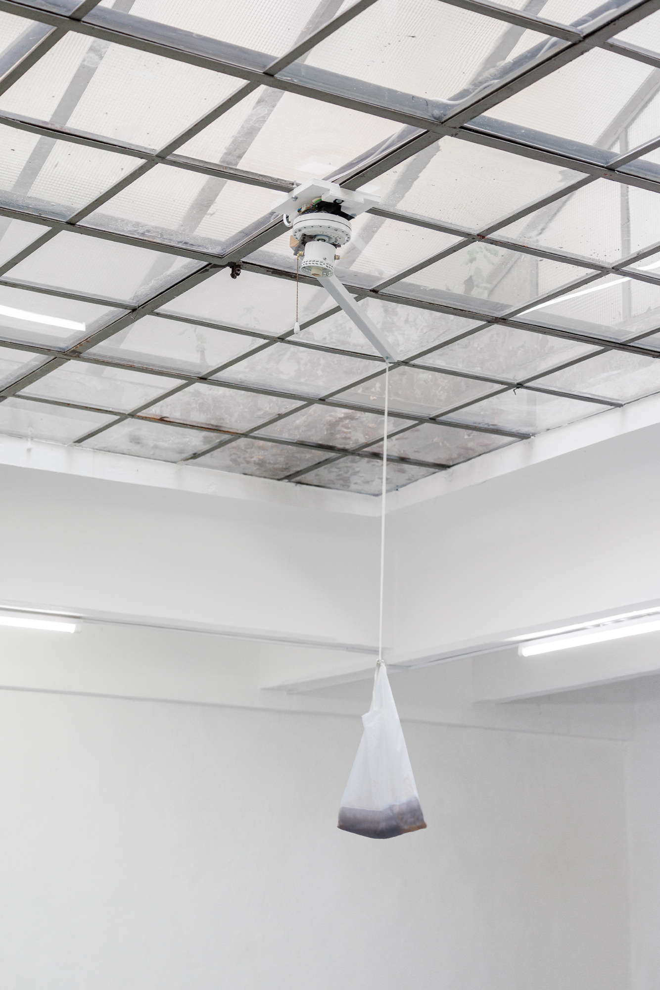Hlywa’s The Image of the Tide (2017) is a motor fan spinning with a translucent bag playing host to a half-dead piece of SCOBY (Symbiotic Culture Of Bacterial Yeast). This messy biomass, which Hlywa usually grows over several months, is life in its basic form: that which is unpredictable and out of control. Usually immersed in a murky brew of tea and sugar, its flesh is in constant metamorphosis. But not this time. The bagged portion is lacking its liquid, its removal being the only condition to allow for the displaying of this SCOBY in its full visibility; as such, it cannot live. The transformation of a life into quasi-dead matter, into an image-commodity for contemplation purposes, comes with a few downsides: it smells pungent; disquietingly, it looks like wan bodily tissue; and it needs to be maintained half-alive by the free labour of the gallery director, who immerses the SCOBY in fermenting liquid every day in order to delay its rotting and final desiccation. The work enacts a reflection on the violence embedded in the economies of exposure, on the extraction of labour and matter upon which capitalism is built, and on the political distinctions between grievable and fungible lives.