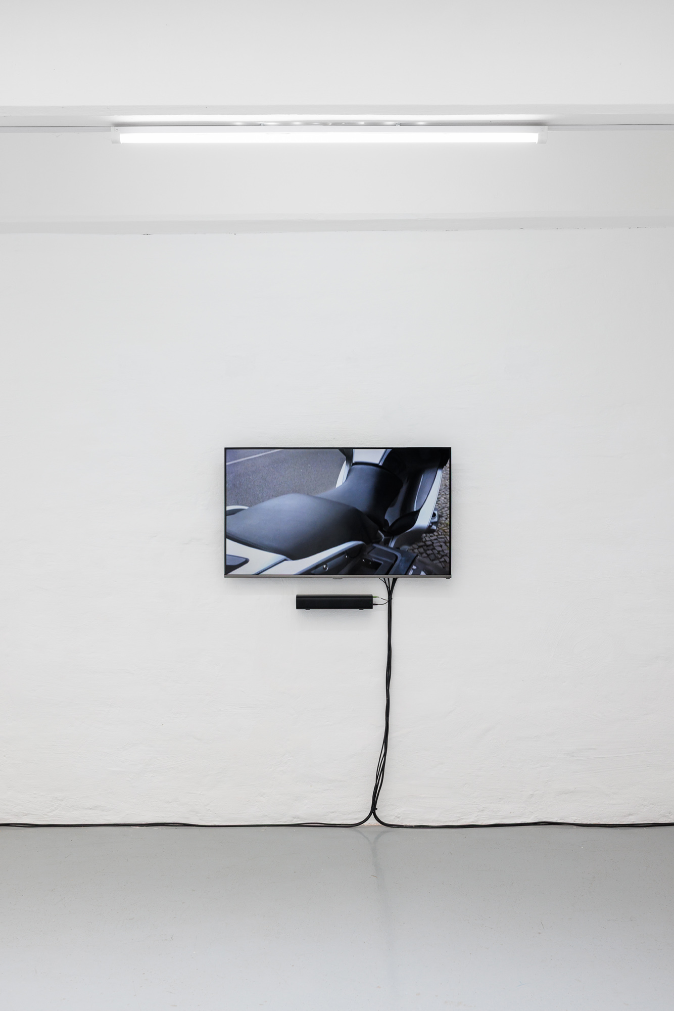 In Keil’s Passive Aggressive (2016), a series of motorcycles parked in the streets of Berlin are individually and laboriously scrutinised by a hand-held camera against a backdrop of loud road and railway noises. The gaze is ambivalent, sometimes scientific and disembodied, other times erotic and personified. In this fantasy, motorbikes stand for commodities to be purchased and ridden in order to confirm the buyer’s desired identity. Even if the portrait of such macho fetishisation is not lacking a dose of parodic banality—indeed, the camera repeatedly tries and fails to obtain full, pornographic visibility of the motorbikes’ innards—it also cruelly taps into traditional Western representations of women: always naked, always horizontal, forever available to be looked at and lusted after. Synced across six channels, the video––together with the installation that keeps the tech apparatus which allows its to function all too visible––frustrates the expectations of a smooth cinematic experience while, more generally, suggesting the inauthenticity of art and of libidinal capitalist economies. Accordingly, the motorbike portraits are briefly interrupted by stock GIFs of sexy winking eyes and excerpts from cartoonish TV commercials, serving as proxies designed to cover up the normative messages they carry.