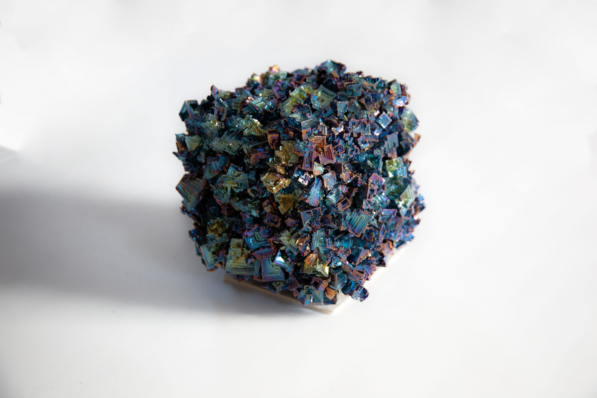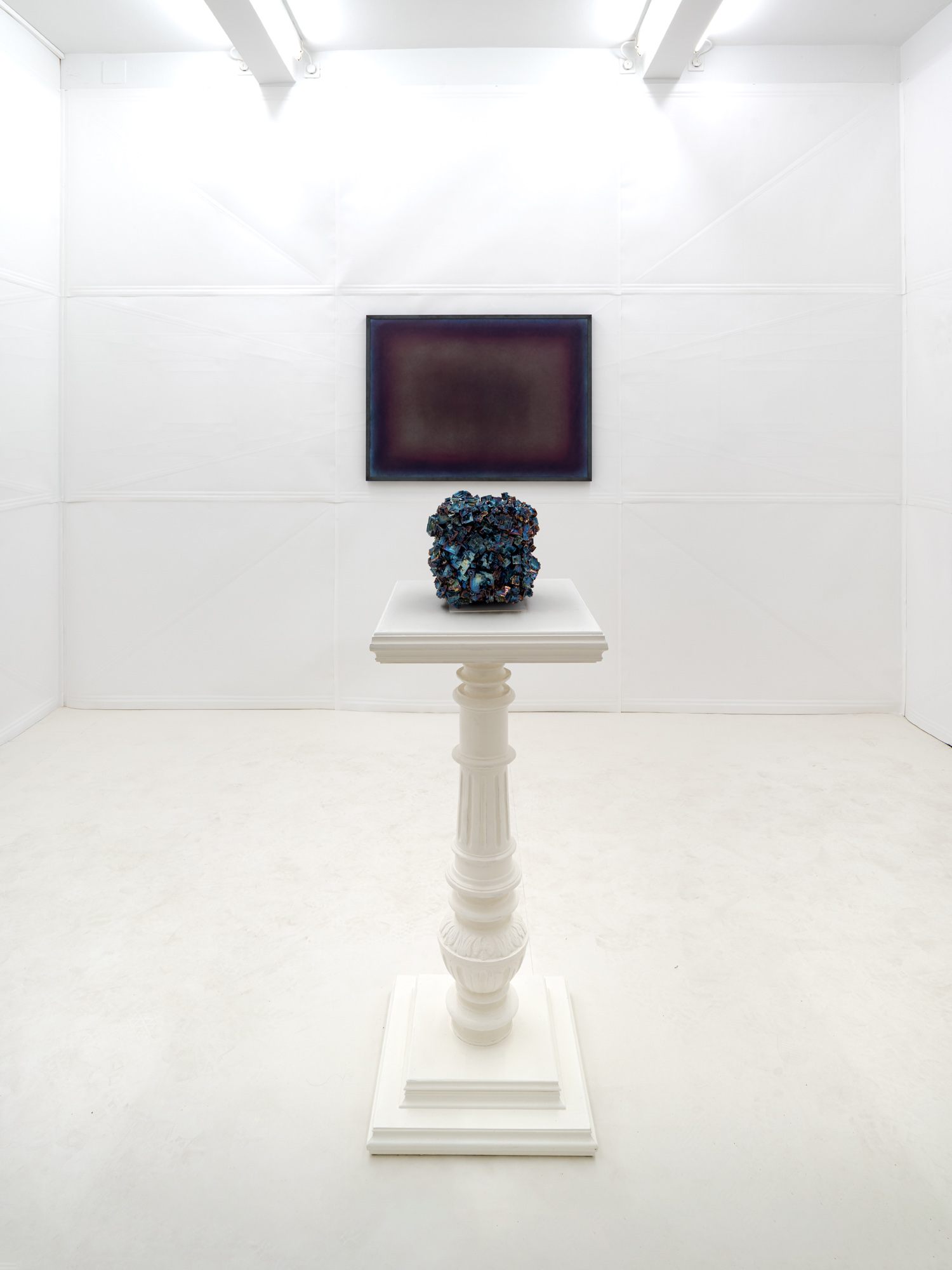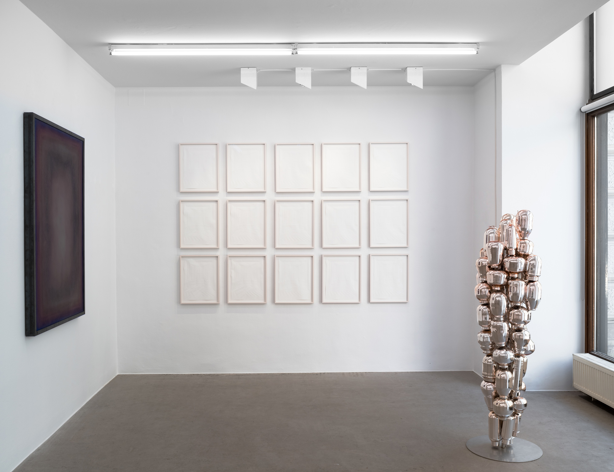 Schubert intensifies the implicit reminder of one’s own transience with a vanitas sculpture placed in the middle of the paper space: his Time Capsule (Zeitkapsel, 2025) consists of crystals of the heavy metal bismuth that he has grown himself and then soldered together. Although bismuth is not hazardous to health, it is very slightly radioactive and extremely stable. It has a half-life of no less than 19 trillion years: an immeasurable period of time for us humans and hardly comprehensible even by cosmic standards, after which this time capsule will release its unknown interior - a period of time that makes us reflect, perhaps also admonishing us to be modest and mindful.