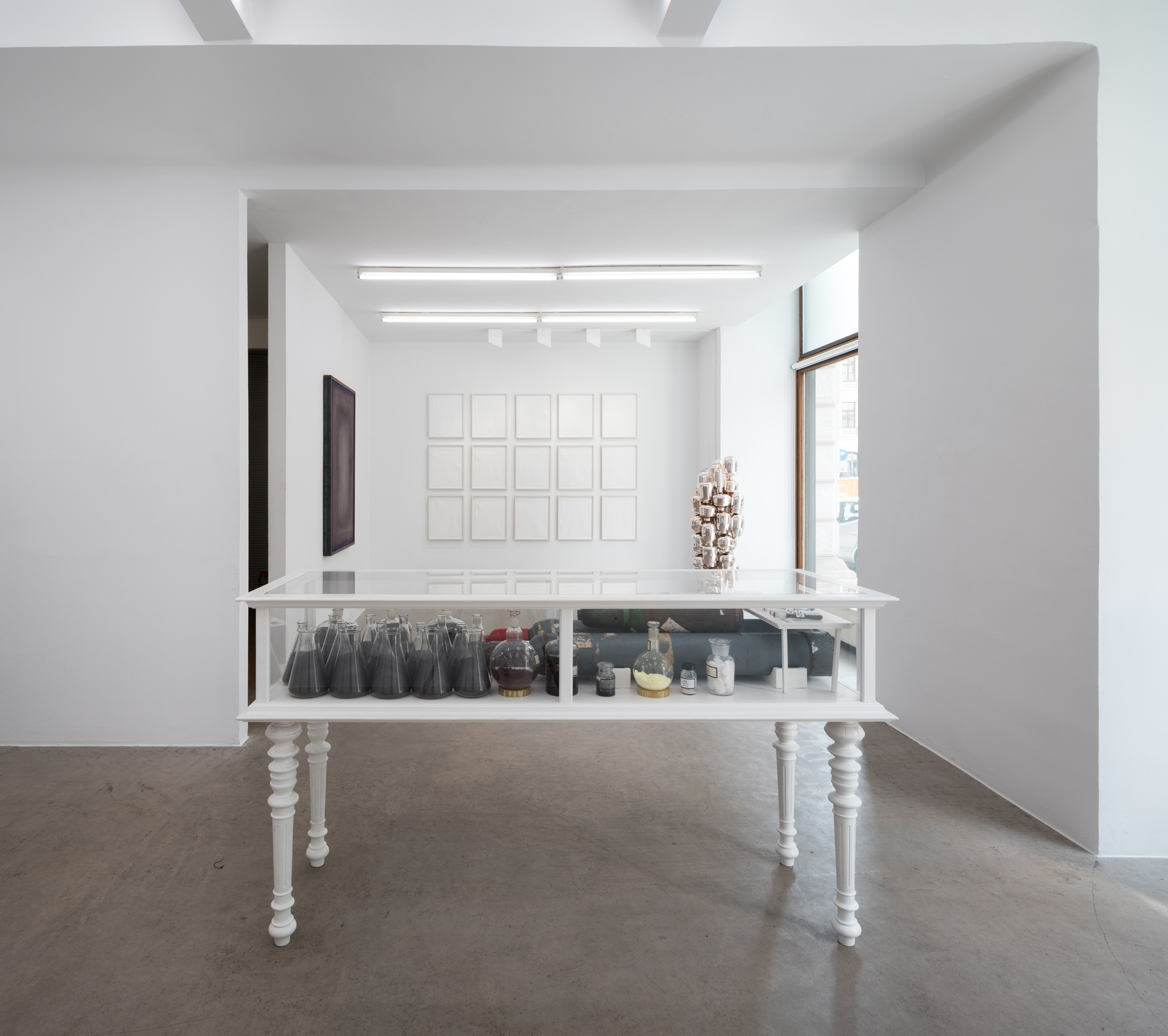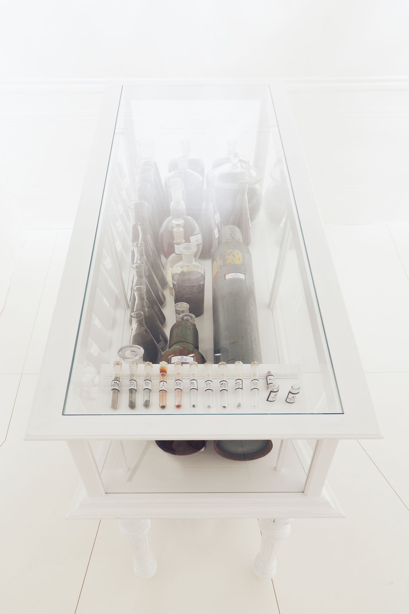 In his Self-portrait (Selbstportrait) from 2014, on the other hand, Simon Schubert concentrates on the undeniable facts. He fills all the individual substances that his body contains in the appropriate quantities, neatly separated into gas bottles, jars and vials: a kit of life, arranged in a glass display case. The display is reminiscent of a scientific laboratory, but also of Snow White’s coffin. Could life, a soul, be breathed back into this person who has been broken down into its biochemical components?
