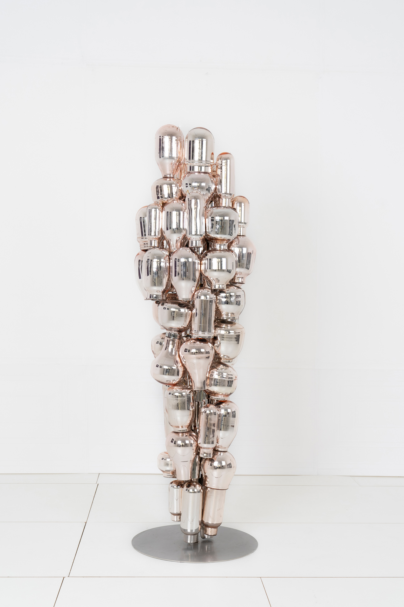 Schubert's upright Dewar body (Dewarkörper, 2024), like the display case, roughly corresponds to the dimensions of his body. He used Dewar vessels (named after their British inventor), which are difficult to identify at first glance and which we find in commercially available thermos flasks. The exposed, mirrored interior of the jugs indirectly refers to people's inner lives. Schubert refers here to Leibniz, for whom, according to the theory of monads, each self-contained monad (soul) expresses the whole world from its perspective like a living mirror. However, he translates this idea into our age of fragmented subjectivity: the sculptural counterpart is composed of a multitude of insulating vessels. The multiplication of the conceivable - material or immaterial - contents stored inside corresponds on the surface to a diversely refracted mirror image in which viewers find themselves multiplied.