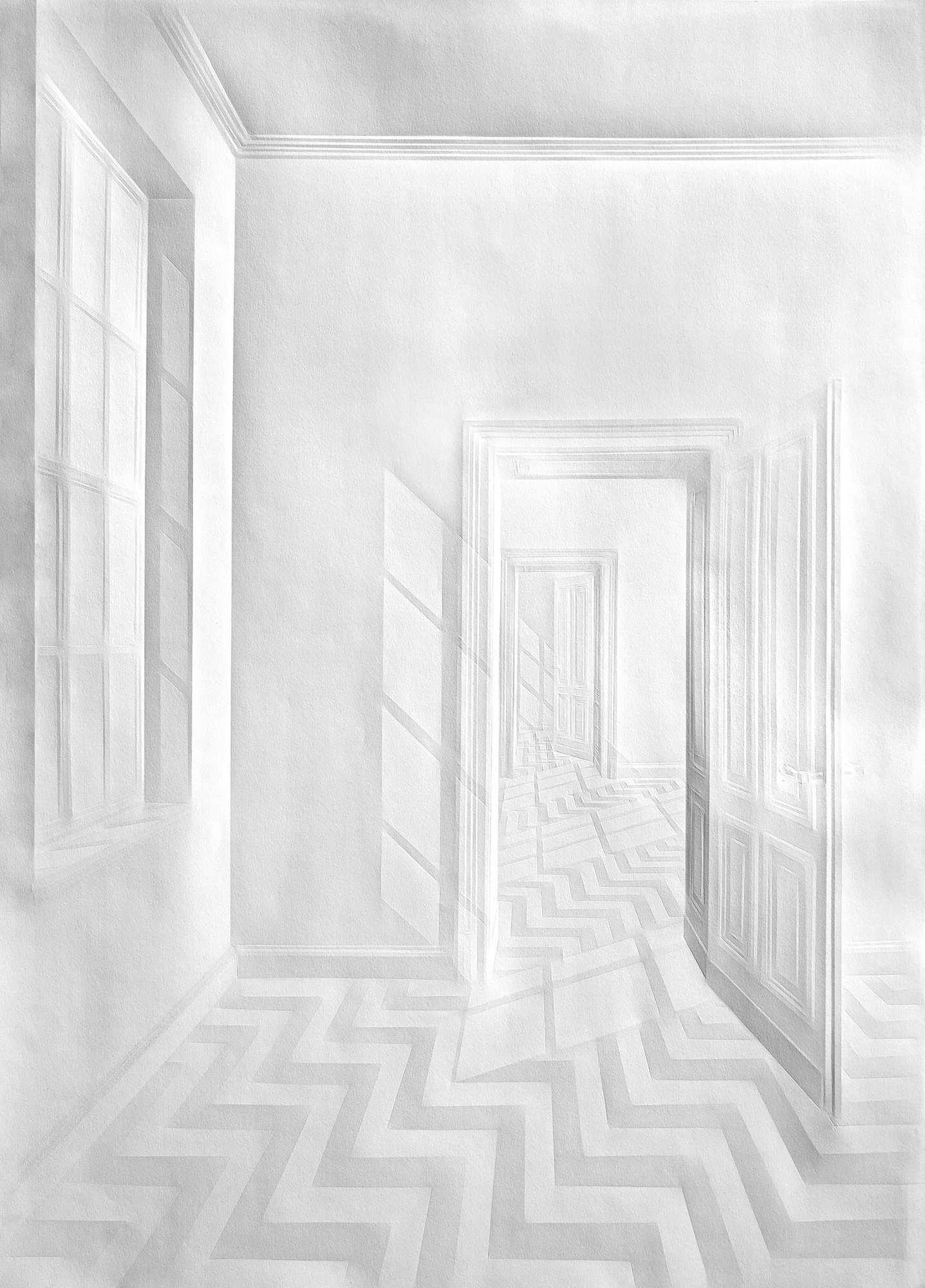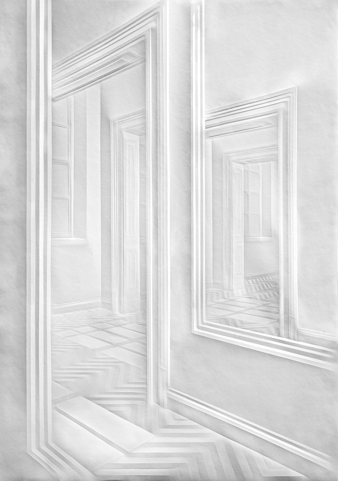 The two sculptures are surrounded by the virtuously folded paper works with which Schubert has become known. He works the paper like a sculptor, adding precise creases and creating relief-like drawings that - once they have been placed in the right light - translate the flat sheet into three-dimensionality and open up imaginary interiors. The viewer is drawn into long corridors and winding staircases, doors and vistas open up into ever new interiors.