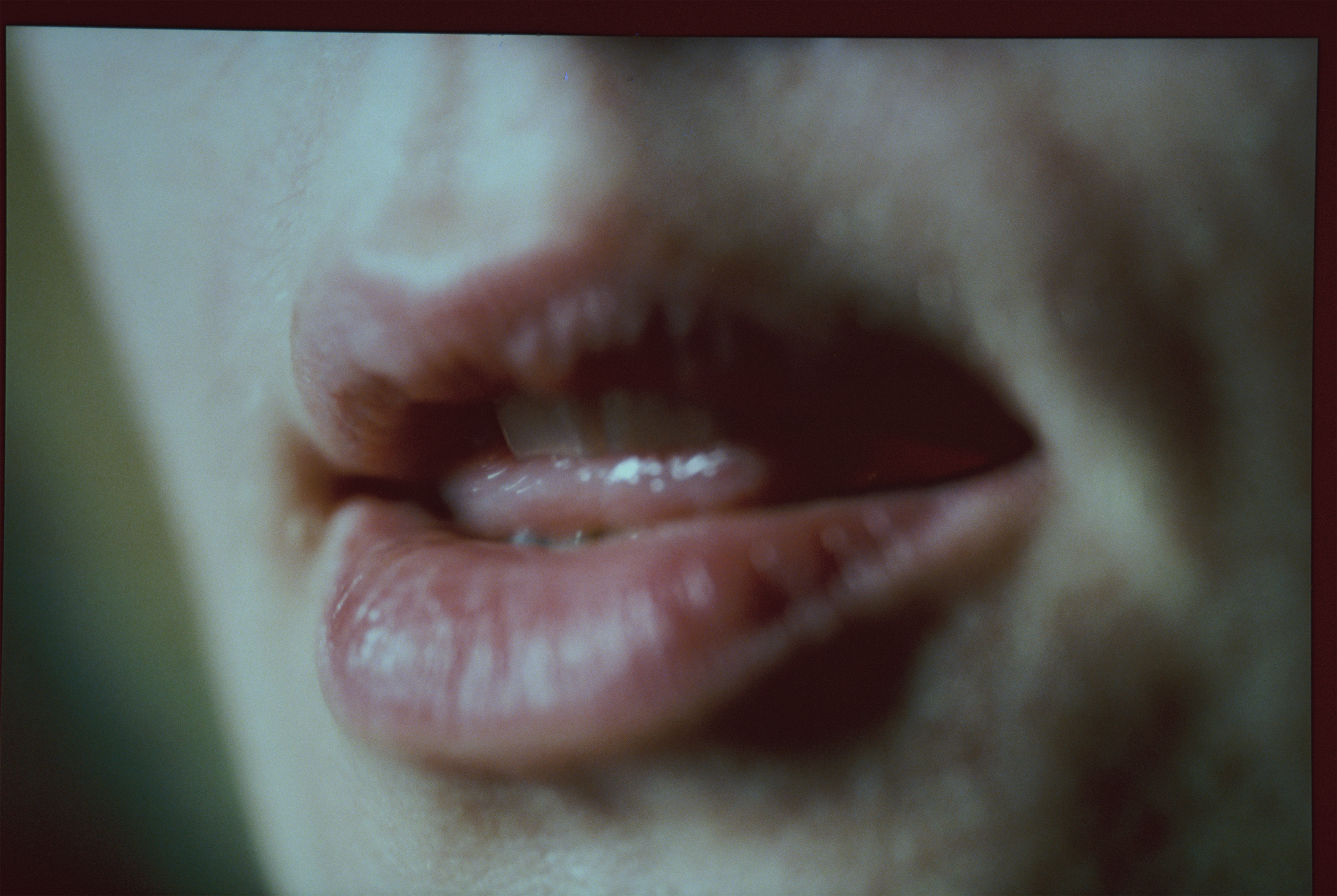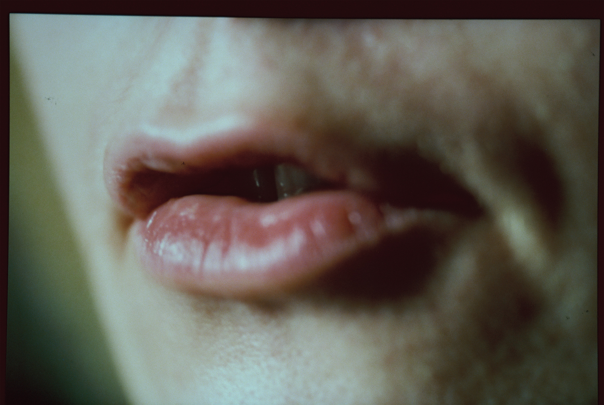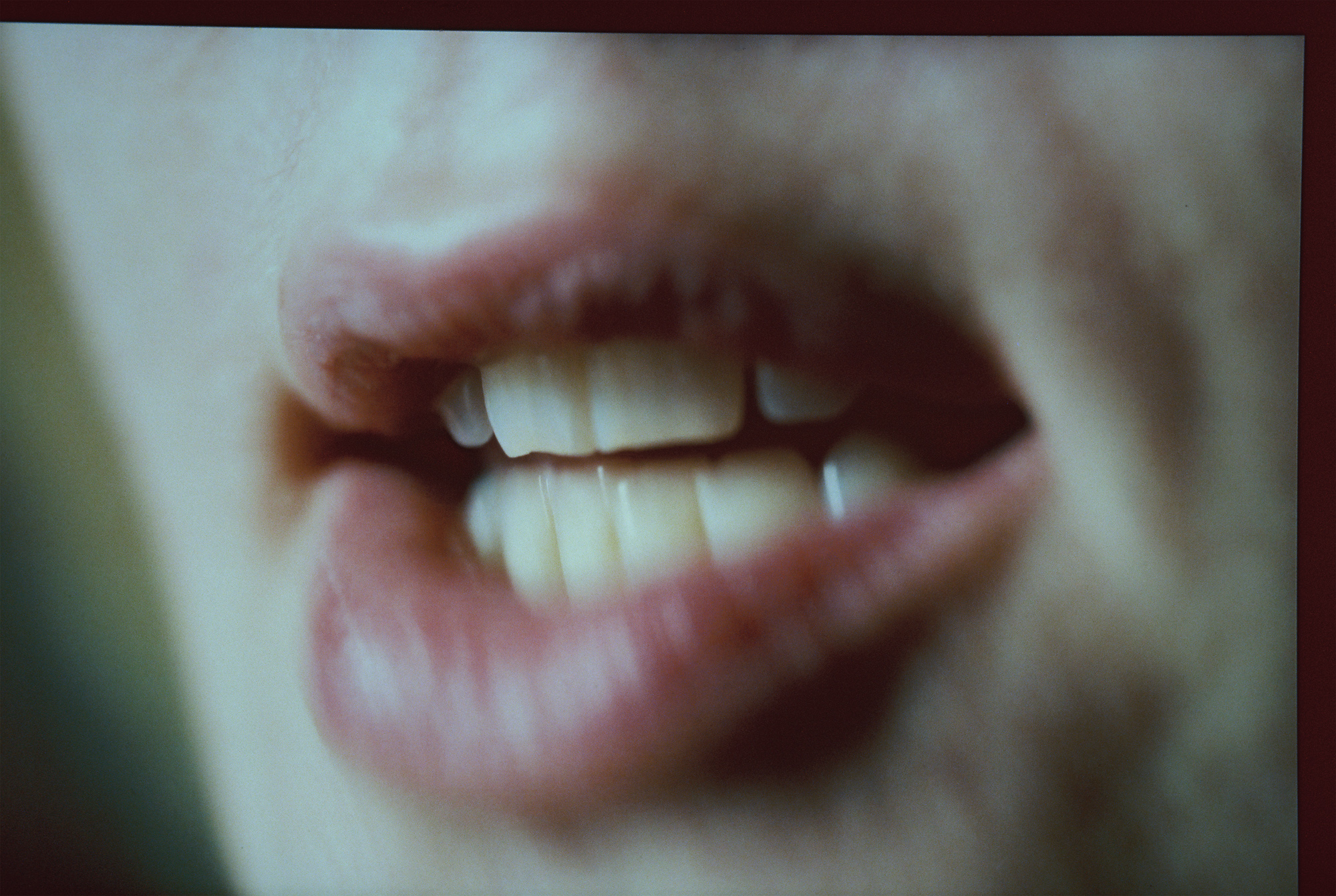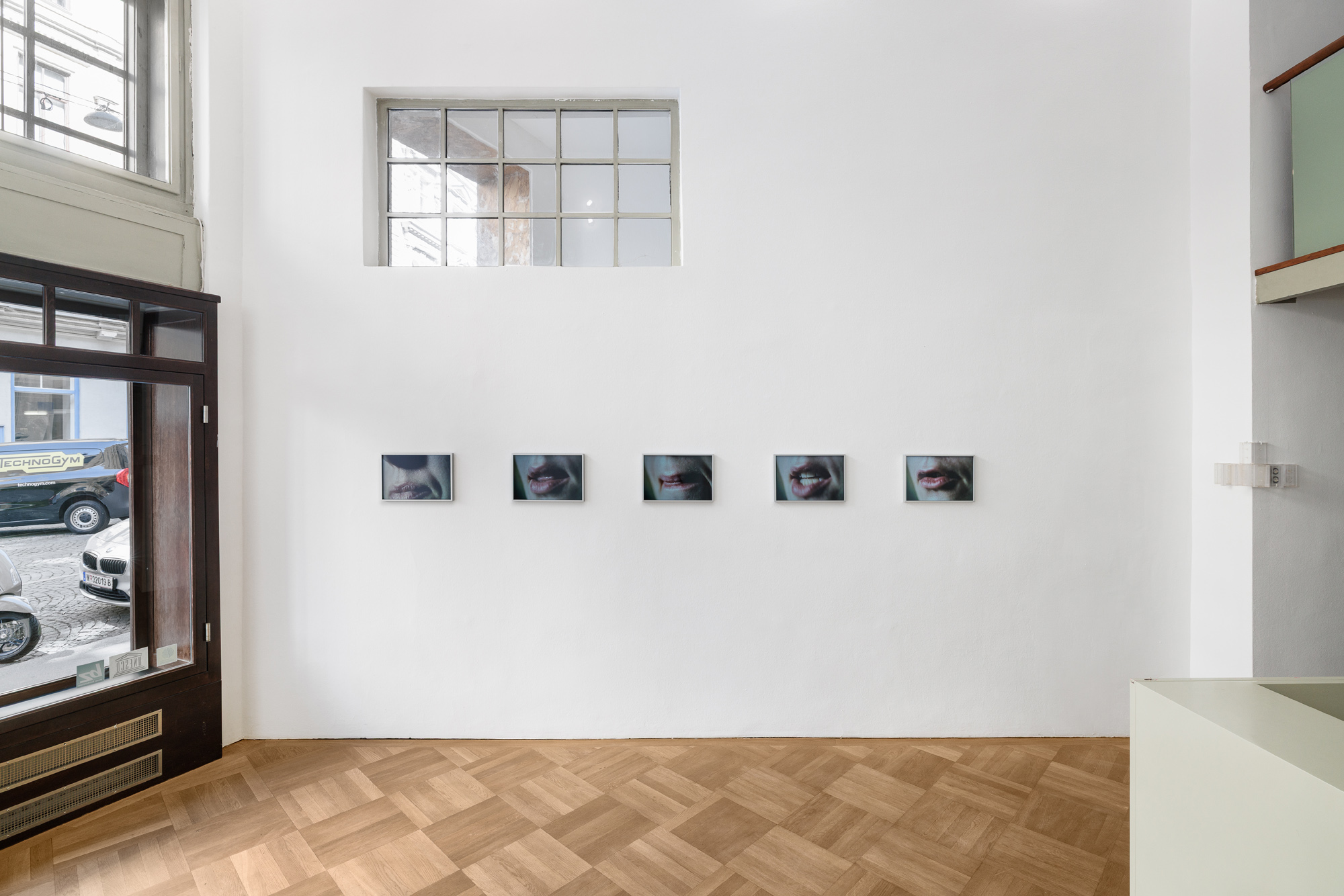 In Angharad Williams’ new suite of photographs, which are fragments of a longer stream of images from a recent solo exhibition, speech is deliberately made inaccessible. We can see the artist moving her lips to form a word, it is there and the artist delivers it, but is remains out of reach since we cannot hear her. The work’s lingering, latent presence creates a sense of unease in the room. Perhaps there is something to be said about the futility and helplessness of speech in this moment in time marked by ongoing wars and human suffering. Speech, usually an outward-turning and communicative act, is here turned inward, muted and displaced into the non-verbal.