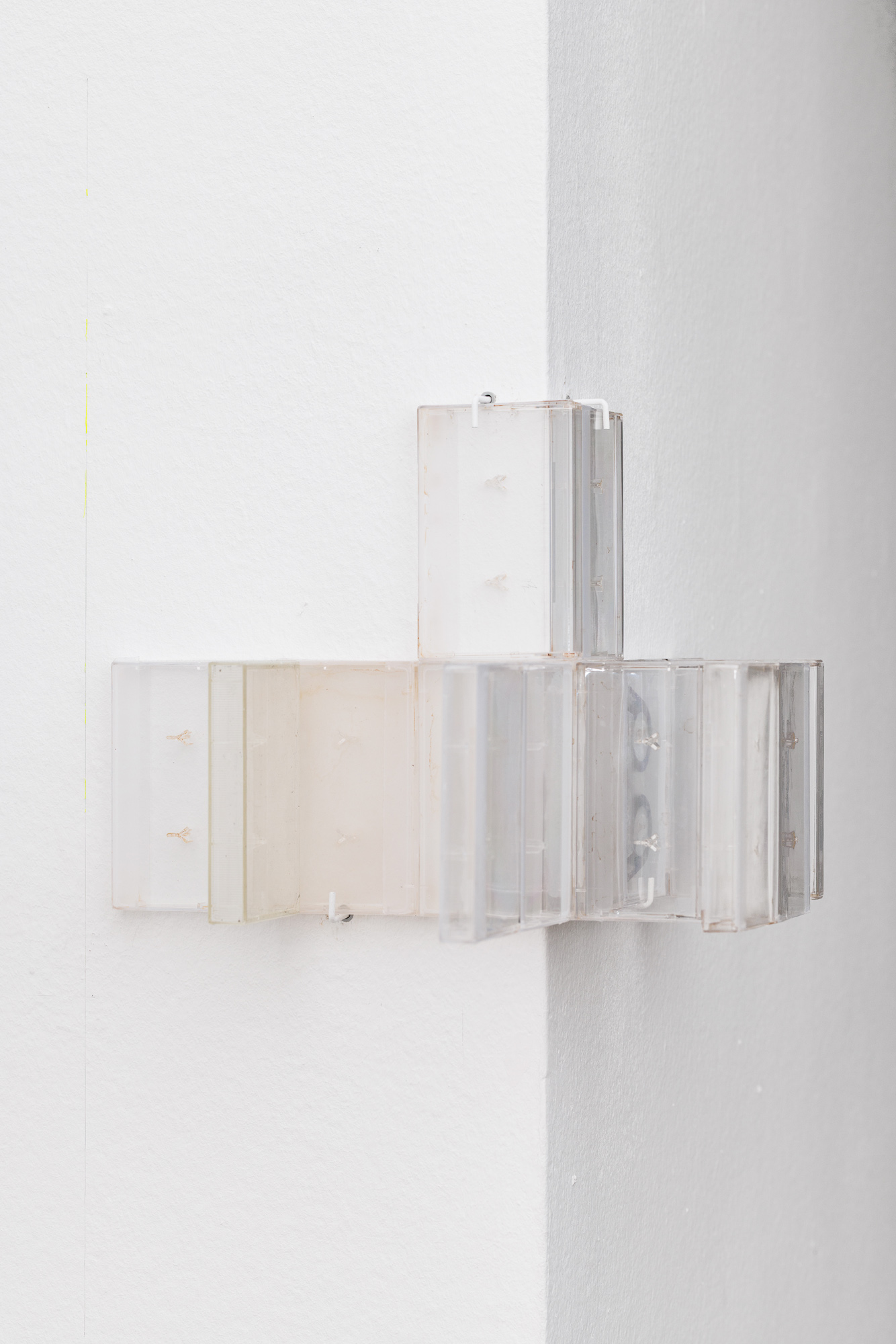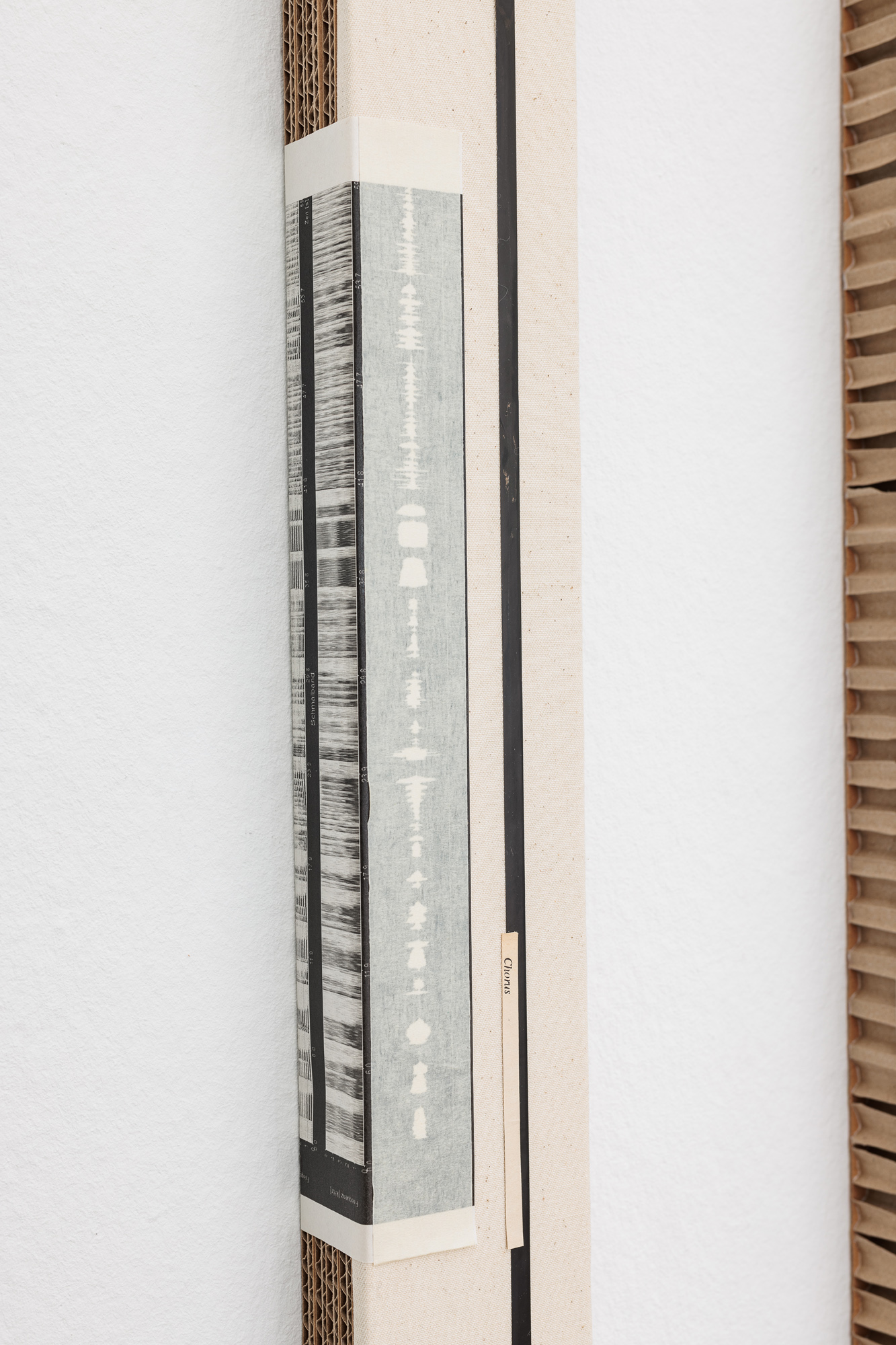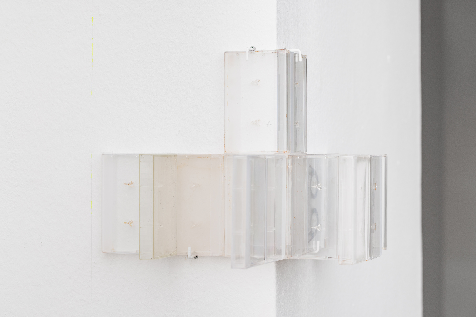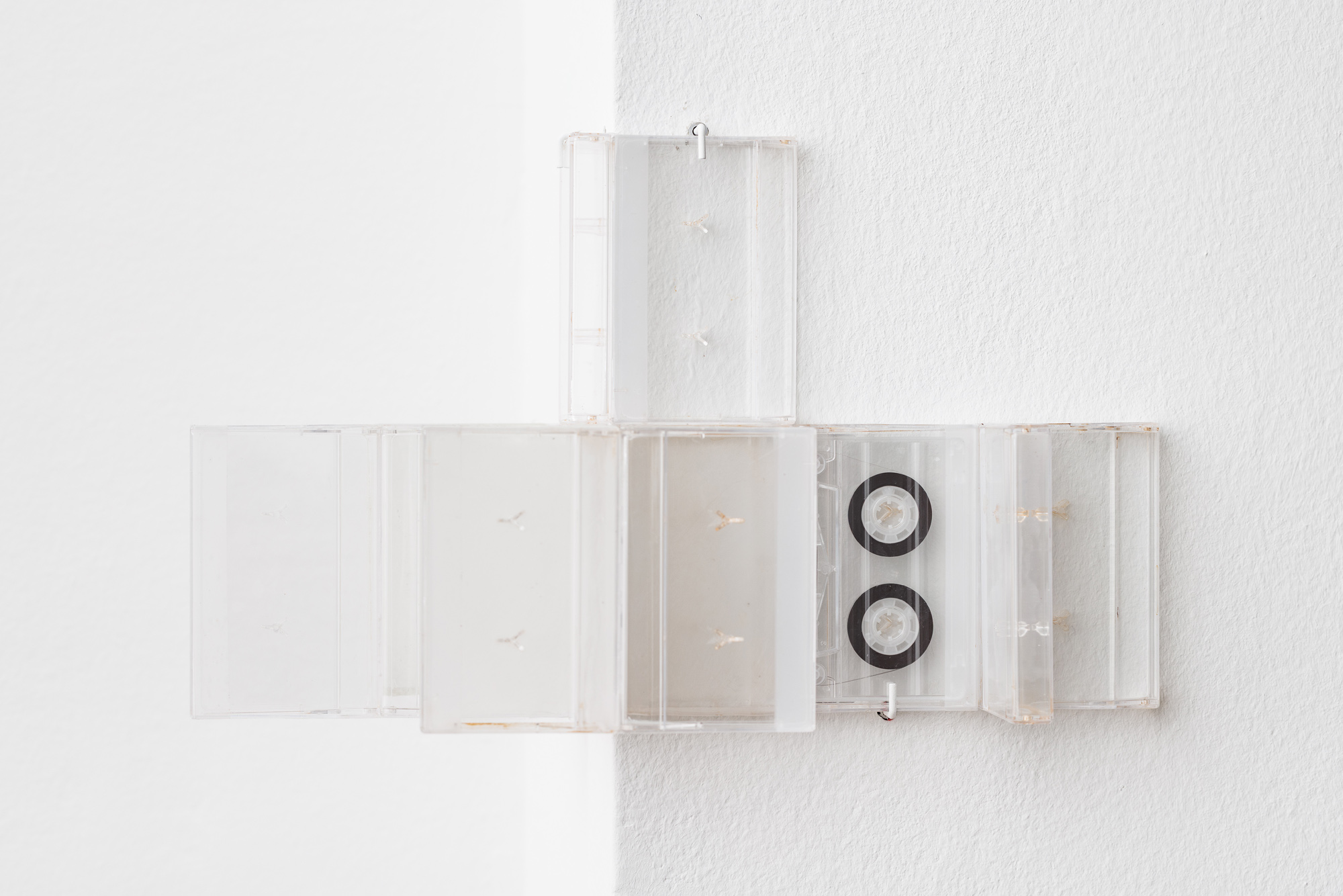 Keta Gavasheli’s multi-media practice likewise draws from a continued engagement with sound, poetry, and performance, often using strategies of collage to approximate the fragmented, opaque nature of memory and interior space. The video work Blurry Middle Distance (2025) for instance sketches a shifting poetic landscape of surfaces, textures, cityscapes, and a demonstration, which are only visible as a blur. As Gavasheli states at one point in the subtitle, it is perhaps wrong to assume that remembering equals owning what is lost, and so the video, while still trying to gather mnemonic fragments, is also a grappling with absence. Other works by Gavasheli containing cassette tape and cassettes act as material records of spoken and performed text by the artist. Language and words appear here only at a distance and as residue, buried, made inaccessible, and archived in another medium.