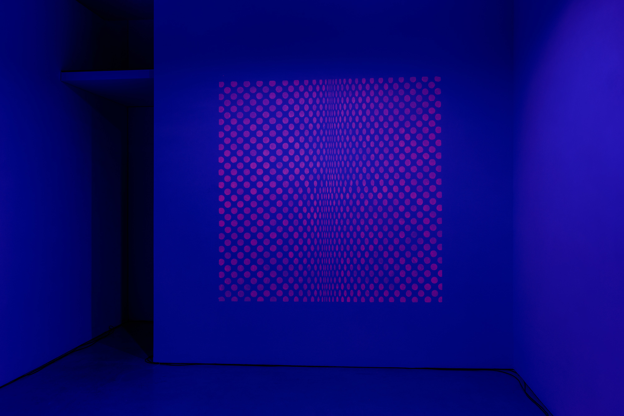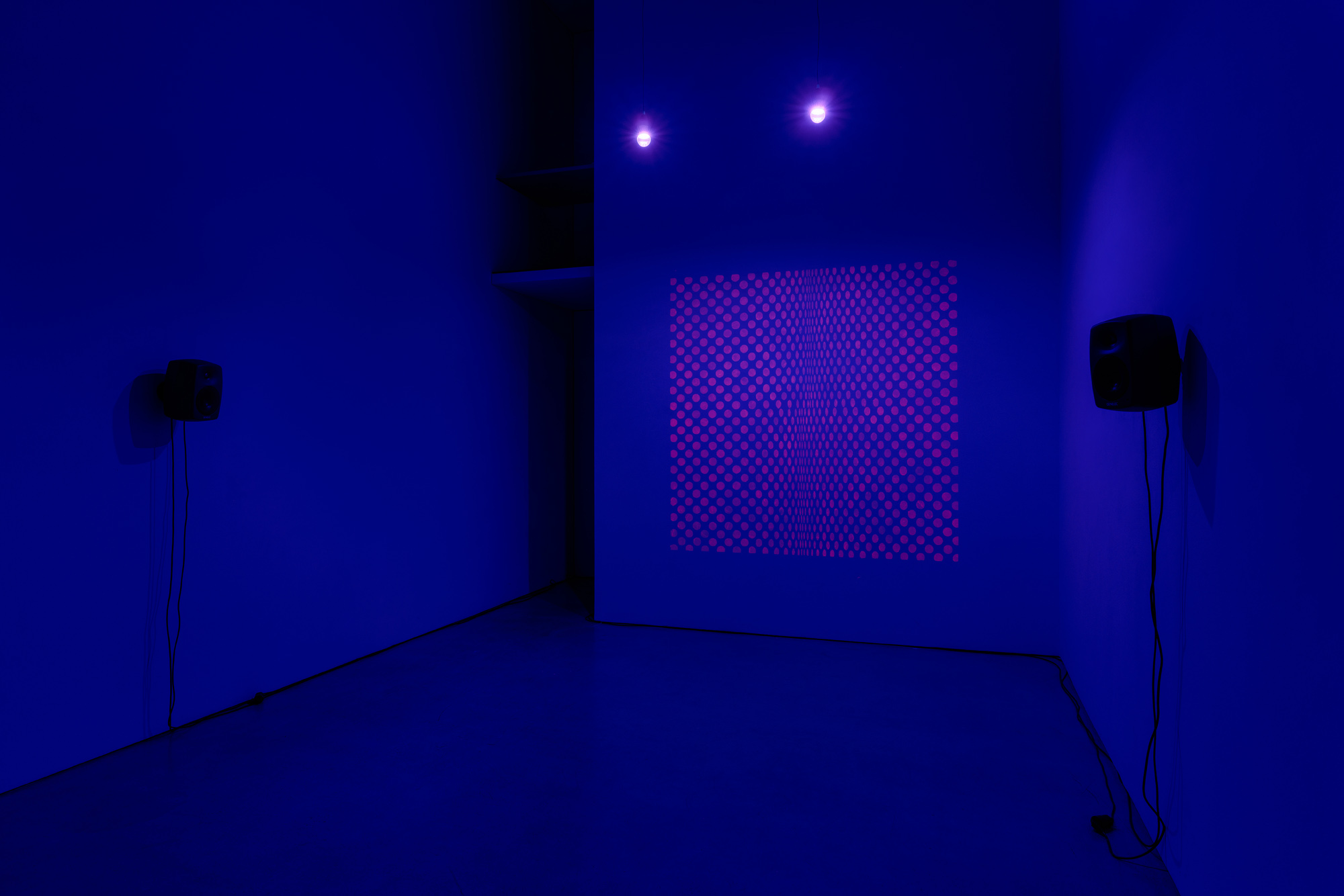 Subliminal Lambada (2024), a sound piece by Nour Mobarak, follows the artist’s long-time enquiry into psychoacoustic phenomena, resting on material processes of sampling, collaging, and patterning of different sonic sources. As we move from childhood into older age, we relate differently to our sonic environment because our sound wave frequency audibility threshold narrows with age. Through varying intonations, Subliminal Lambada creates a hallucinatory soundscape in which words and sounds are more or less audible, distorted, filtered and underlaid with changing tones. These shifts in mood and audibility are sometimes grounding, and at others disorienting and confusing, exploring the shifting relationship with our sonic environment over time. Sounds, like words, become palpable as profoundly affective textures through which we relate not only to the exterior world, but also to ourselves and to a biographic timeline. Subliminal Lambada is accompanied by a new visual work which can only be seen with UV light, exploring our perception of different light wave frequencies.