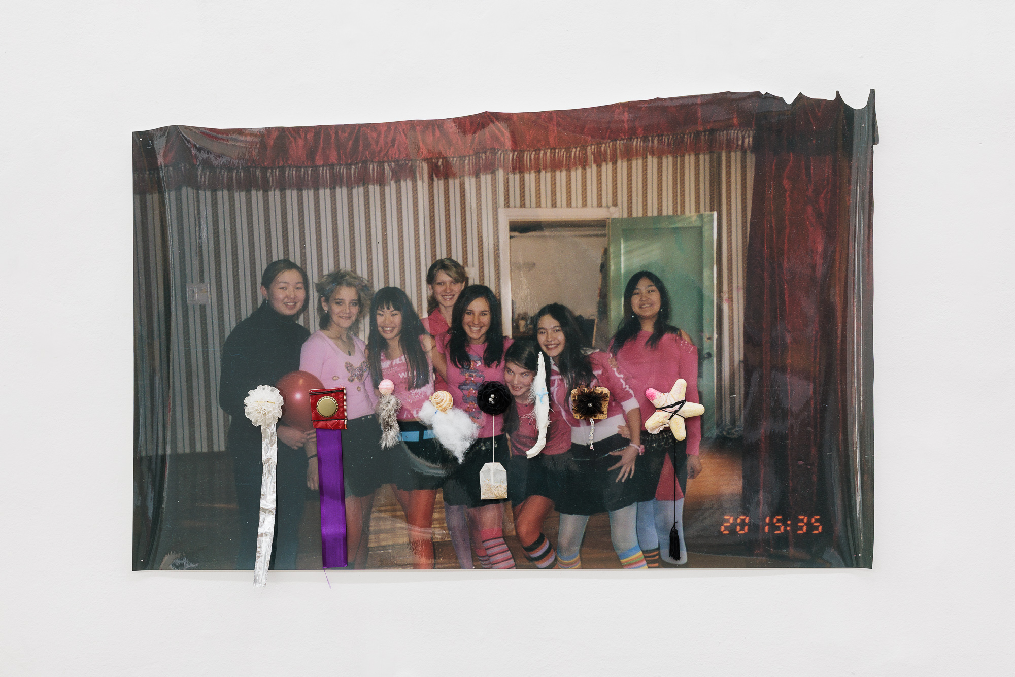 Sveta Mordovskaya, Girls and Medals, 2024, c-print, fur, lollipop, nail polish, papier-mâché, feather, string, aluminium, foil, faux leather, fair pin, ribbon, lid, tea bag, acrylic, styrofoam, sequins, cork, snail, wadding, 124 x 81,5 x 6 cm
