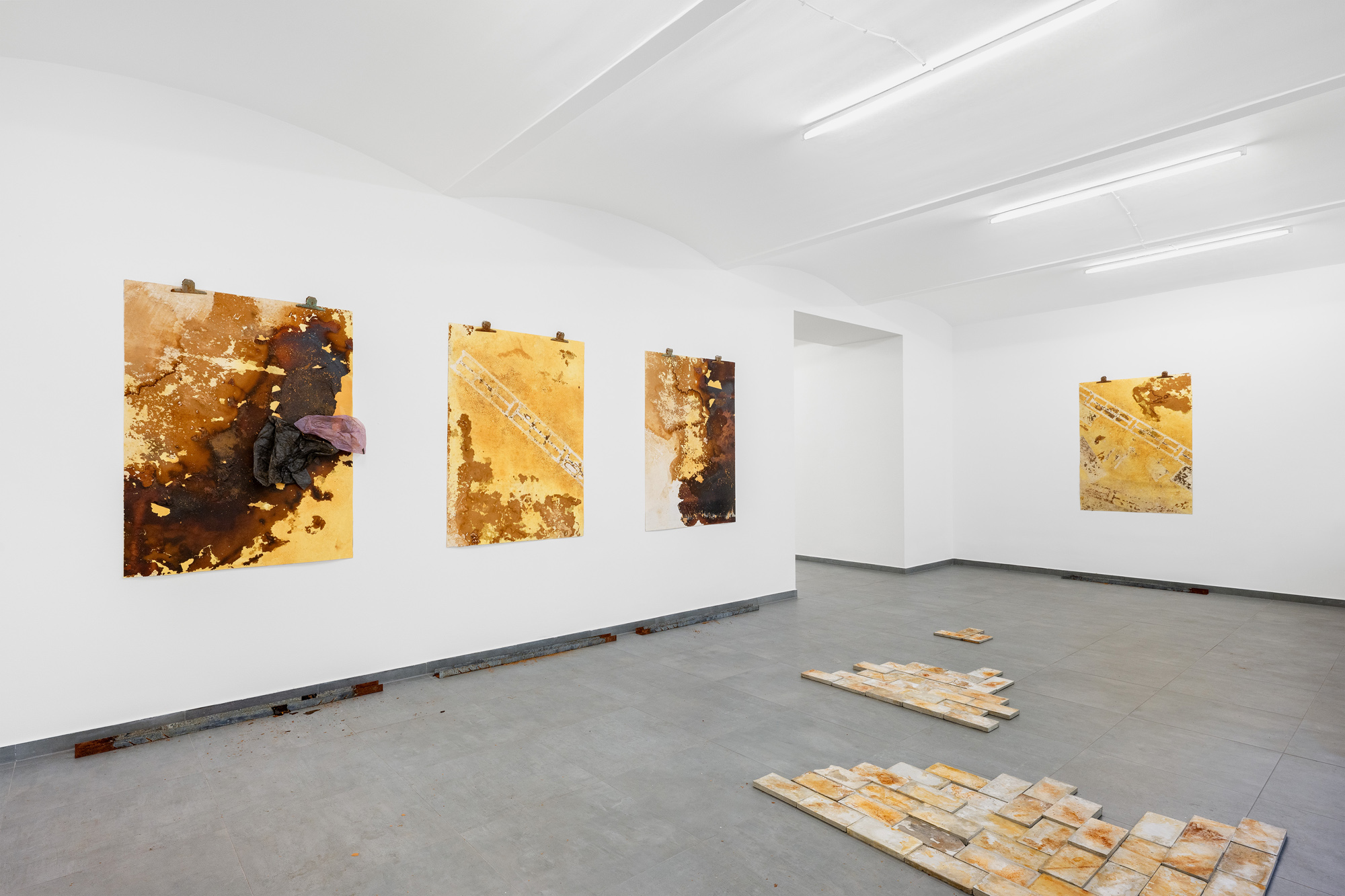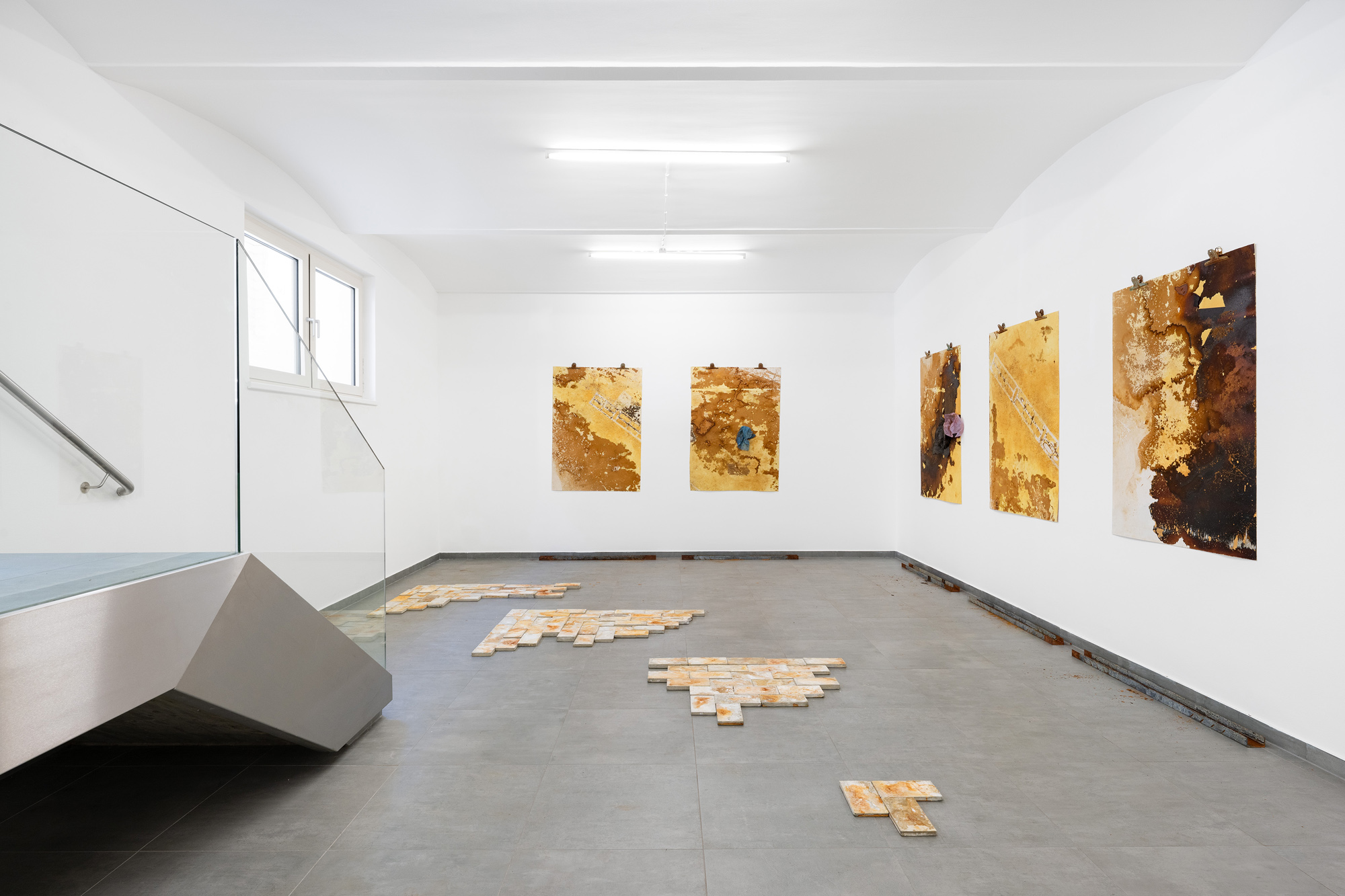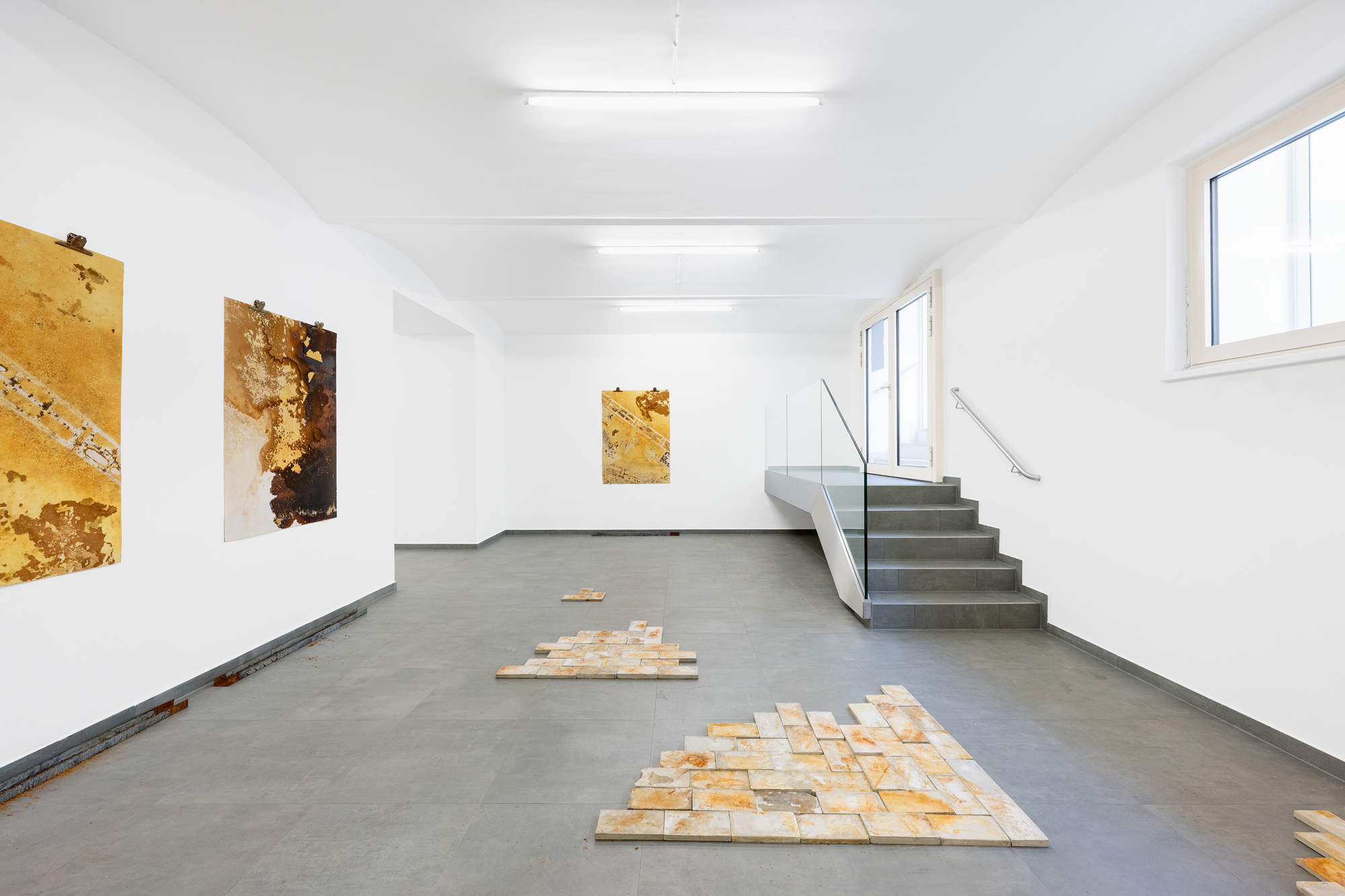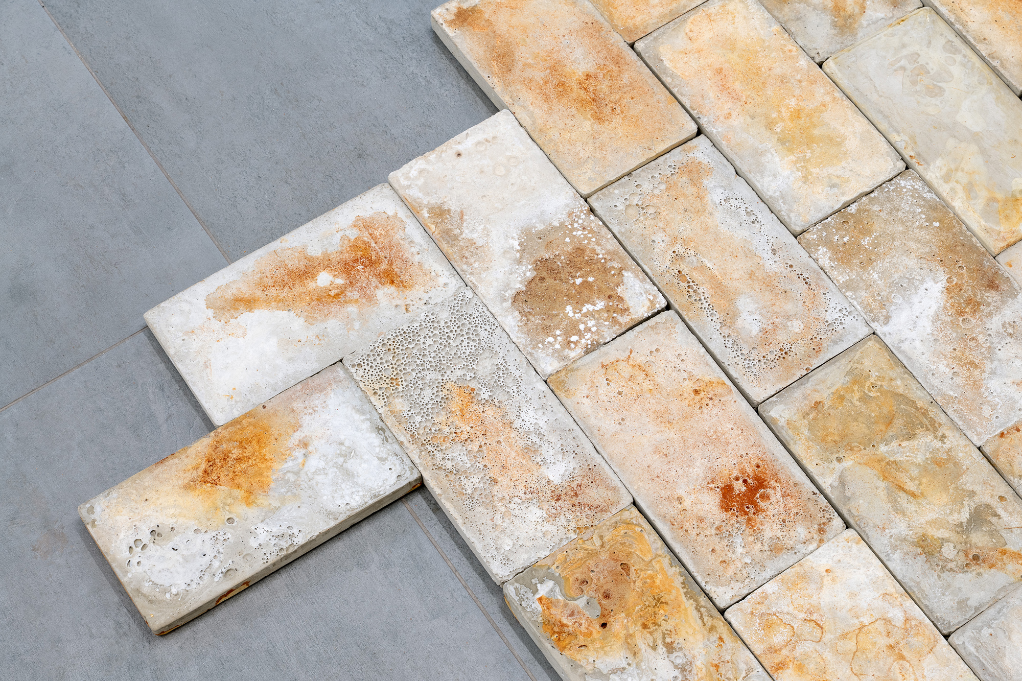 For over five years, Ouassila Arras has been moving a cinder block wall on her own to the exhibition spaces that have invited her, for as many days as the room’s dimensions allow. The performance she undertakes is immense, difficult, repetitive. Yet, it is merely a fragment of the physical efforts made by her Algerian father on French construction sites for over forty years. The mortar of the wall is replaced by henna—associated with her mother—whose tenacious, orange-coloured, and fragrant imprint traces the map of the successive movements of this border on the ground. For the first time, Ouassila Arras has chosen to hang fragments of this stained floor on the wall, thus creating a kind of unique shift or movement. On the gallery floor, rusty concrete tiles, the same size as the cobblestones on certain Viennese streets, are meant to be walked on by visitors. Moving around the hushed space of the gallery, which we initially imagine to be free and easy, is radically transformed as the sculpture gives way beneath our feet and stability leads to vertigo.