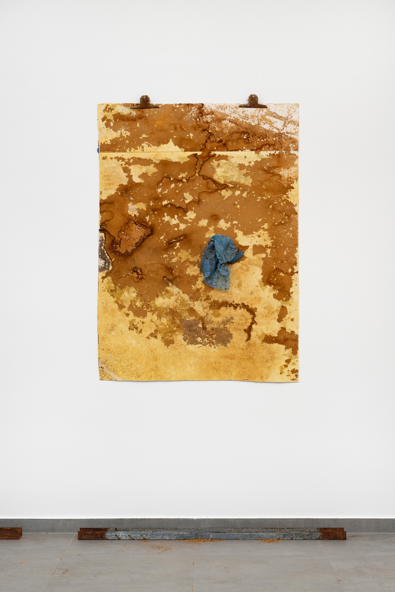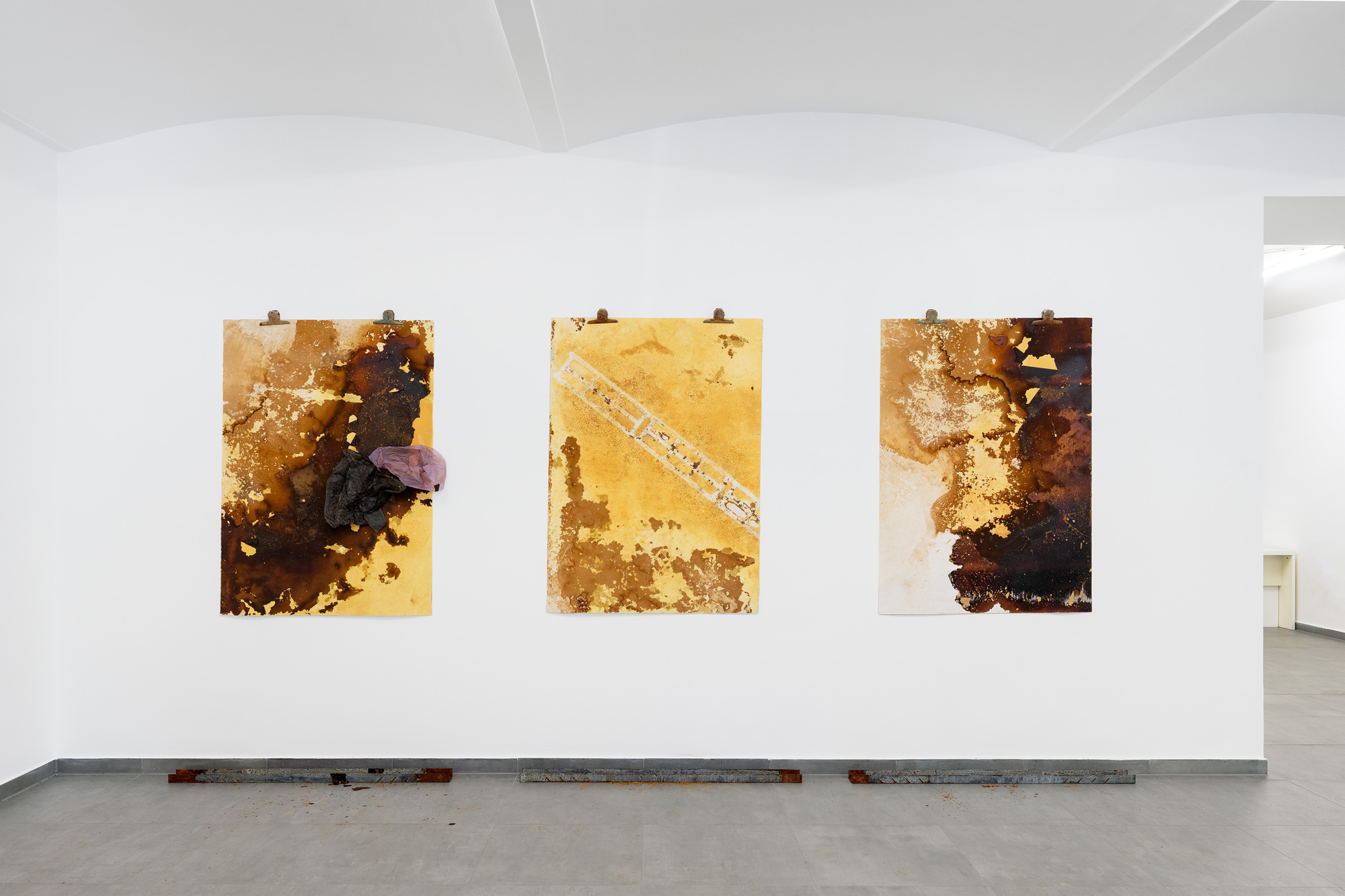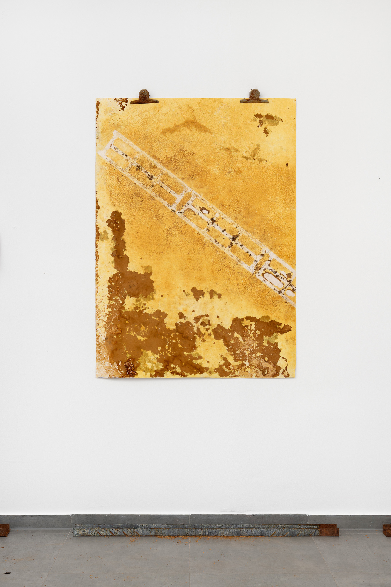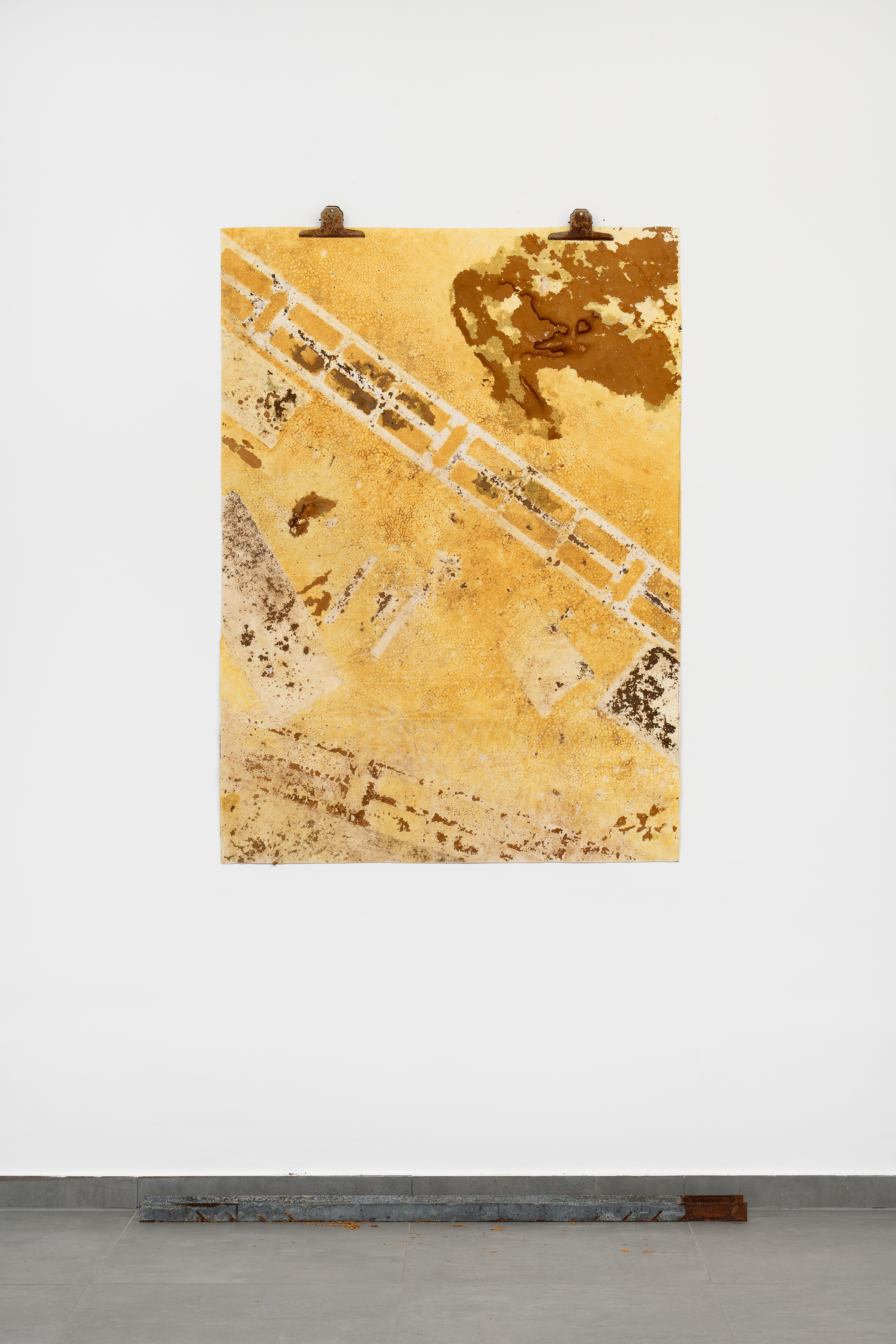 For over five years, Ouassila Arras has been moving a cinder block wall on her own to the exhibition spaces that have invited her, for as many days as the room’s dimensions allow. The performance she undertakes is immense, difficult, repetitive. Yet, it is merely a fragment of the physical efforts made by her Algerian father on French construction sites for over forty years. The mortar of the wall is replaced by henna—associated with her mother—whose tenacious, orange-coloured, and fragrant imprint traces the map of the successive movements of this border on the ground. For the first time, Ouassila Arras has chosen to hang fragments of this stained floor on the wall, thus creating a kind of unique shift or movement. On the gallery floor, rusty concrete tiles, the same size as the cobblestones on certain Viennese streets, are meant to be walked on by visitors. Moving around the hushed space of the gallery, which we initially imagine to be free and easy, is radically transformed as the sculpture gives way beneath our feet and stability leads to vertigo.