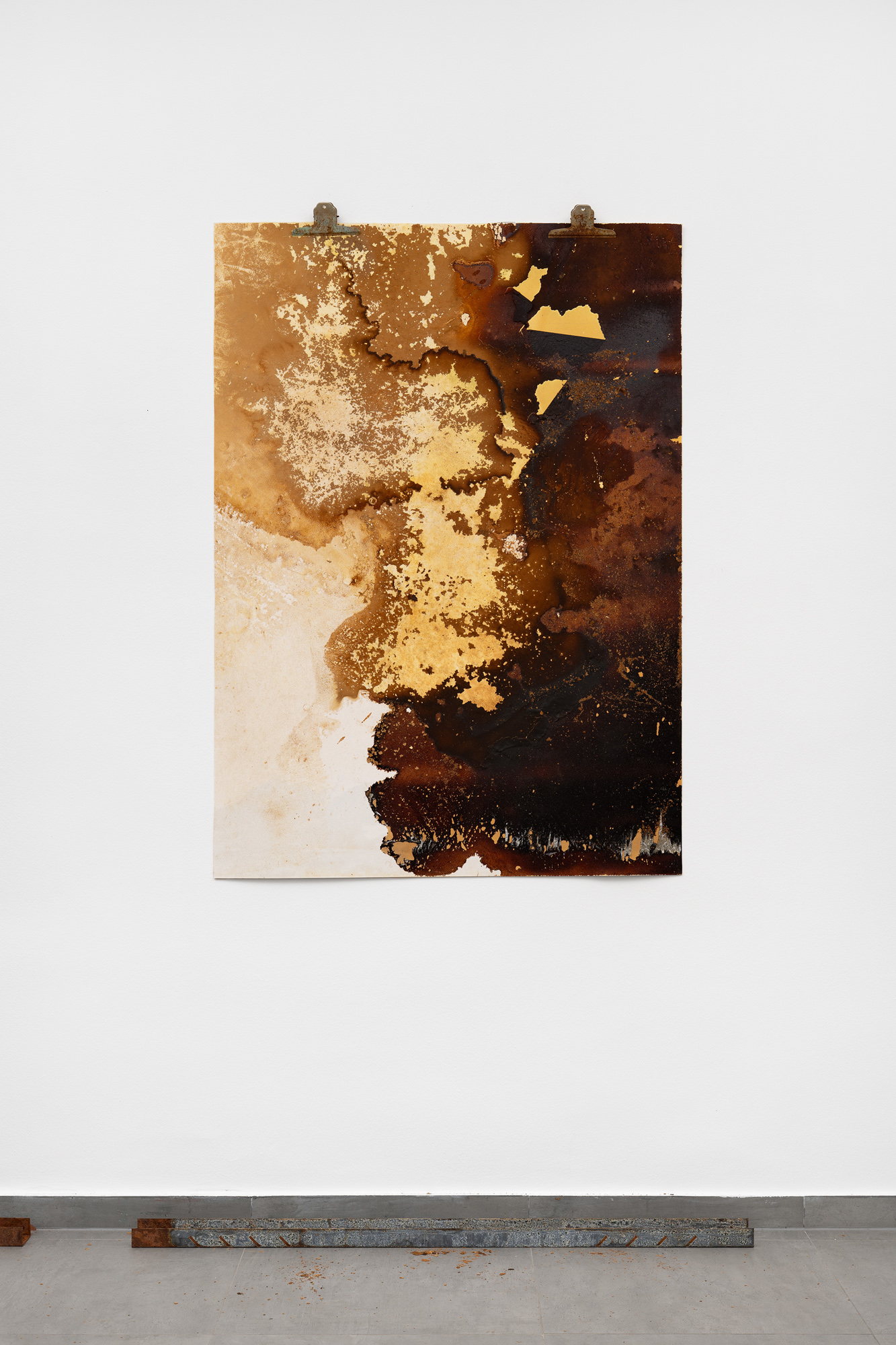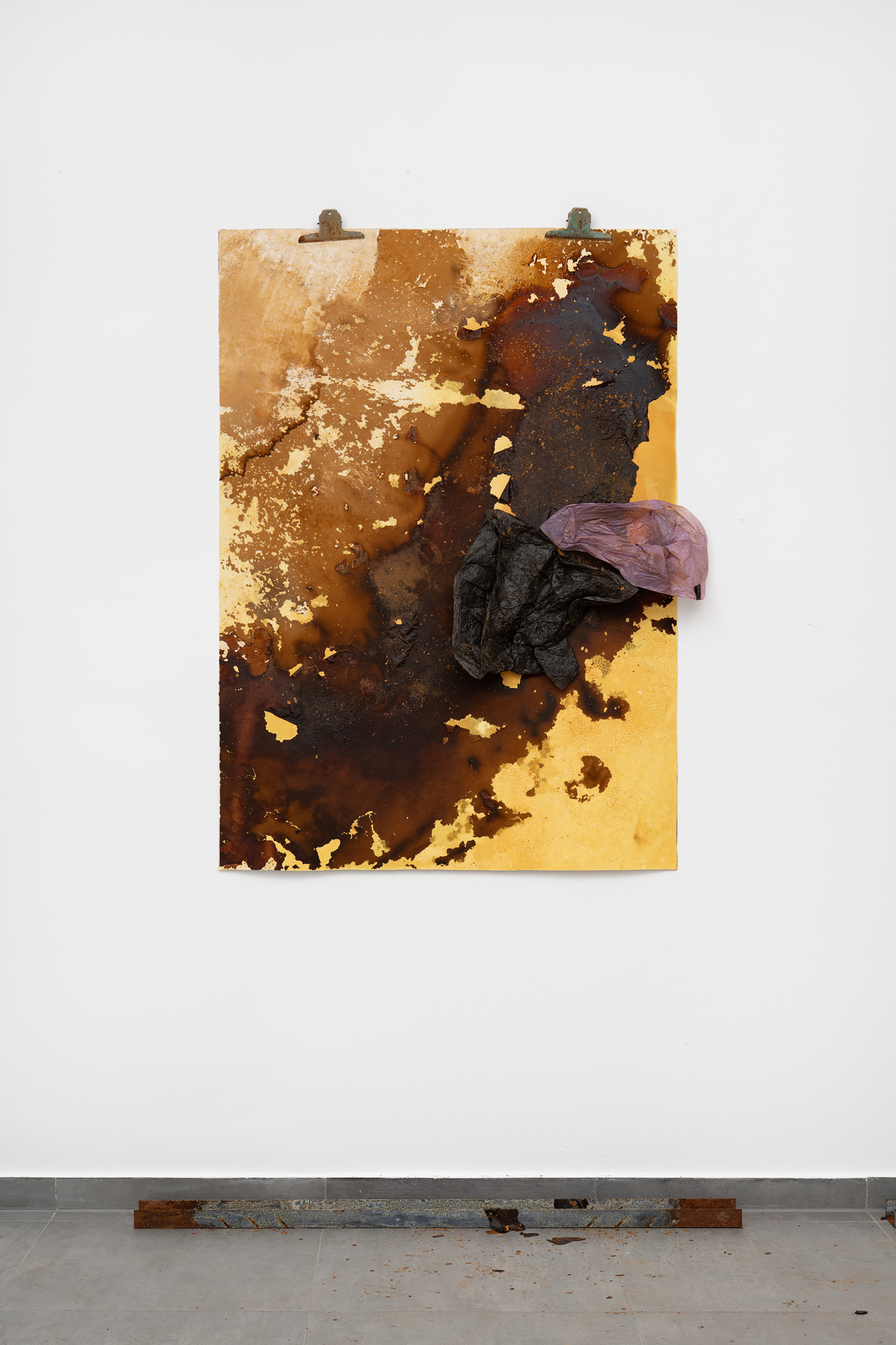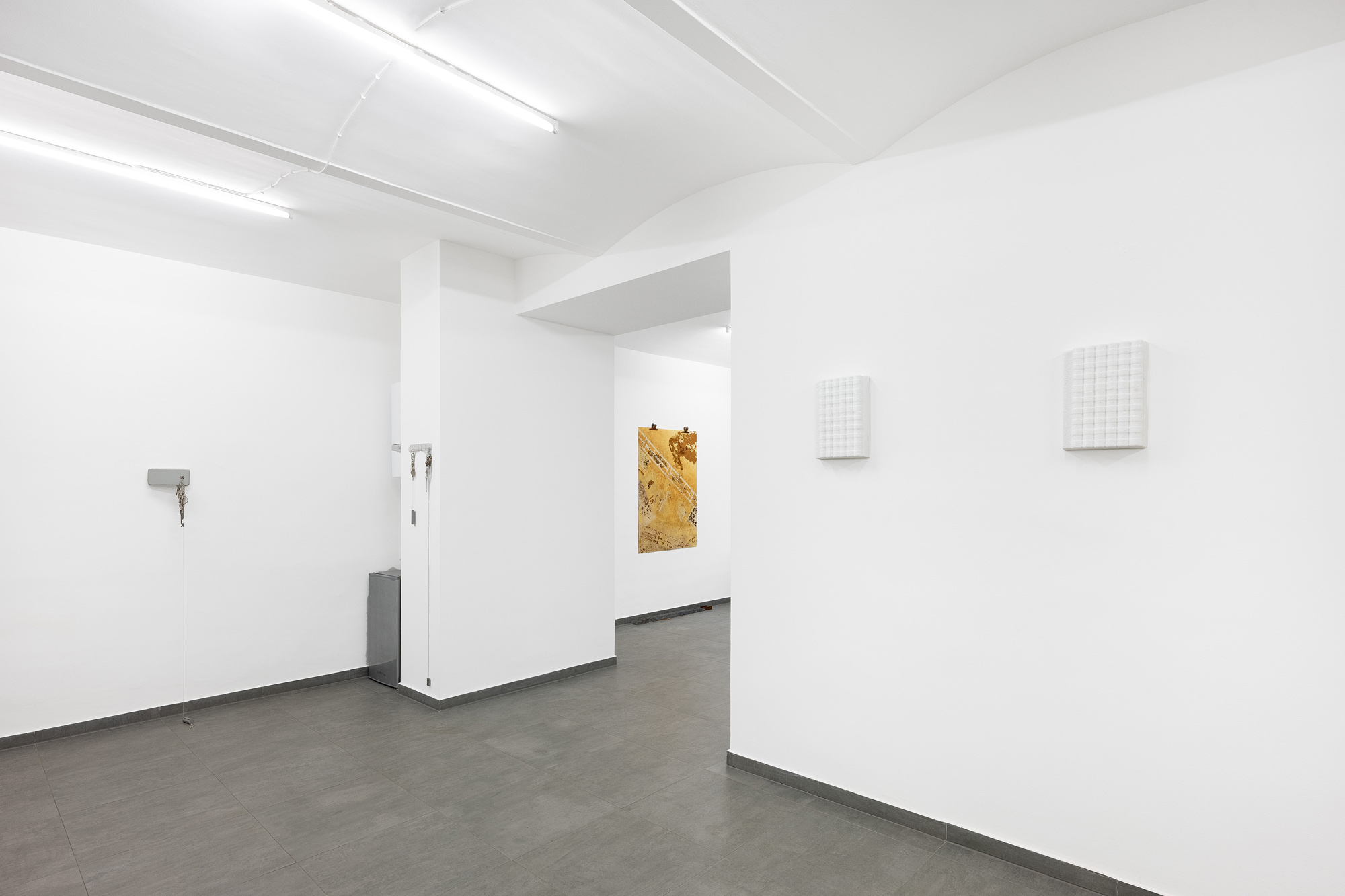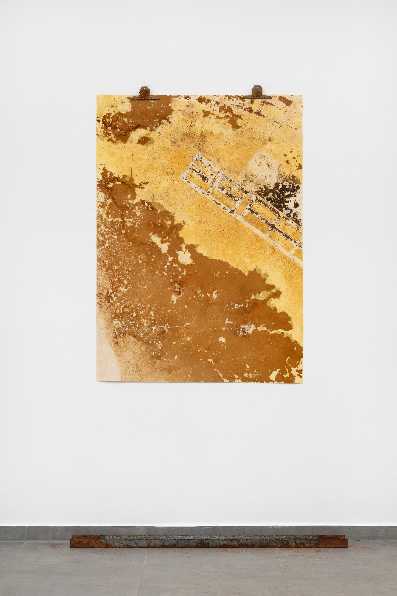 For over five years, Ouassila Arras has been moving a cinder block wall on her own to the exhibition spaces that have invited her, for as many days as the room’s dimensions allow. The performance she undertakes is immense, difficult, repetitive. Yet, it is merely a fragment of the physical efforts made by her Algerian father on French construction sites for over forty years. The mortar of the wall is replaced by henna—associated with her mother—whose tenacious, orange-coloured, and fragrant imprint traces the map of the successive movements of this border on the ground. For the first time, Ouassila Arras has chosen to hang fragments of this stained floor on the wall, thus creating a kind of unique shift or movement. On the gallery floor, rusty concrete tiles, the same size as the cobblestones on certain Viennese streets, are meant to be walked on by visitors. Moving around the hushed space of the gallery, which we initially imagine to be free and easy, is radically transformed as the sculpture gives way beneath our feet and stability leads to vertigo.