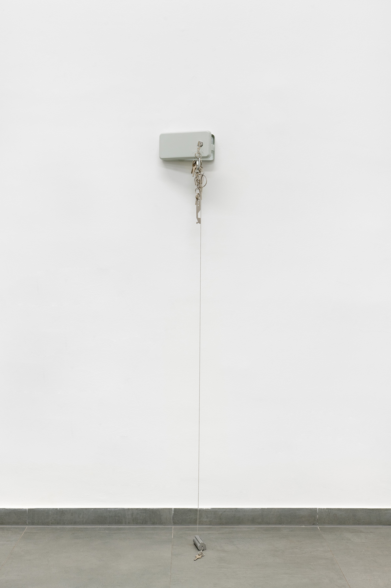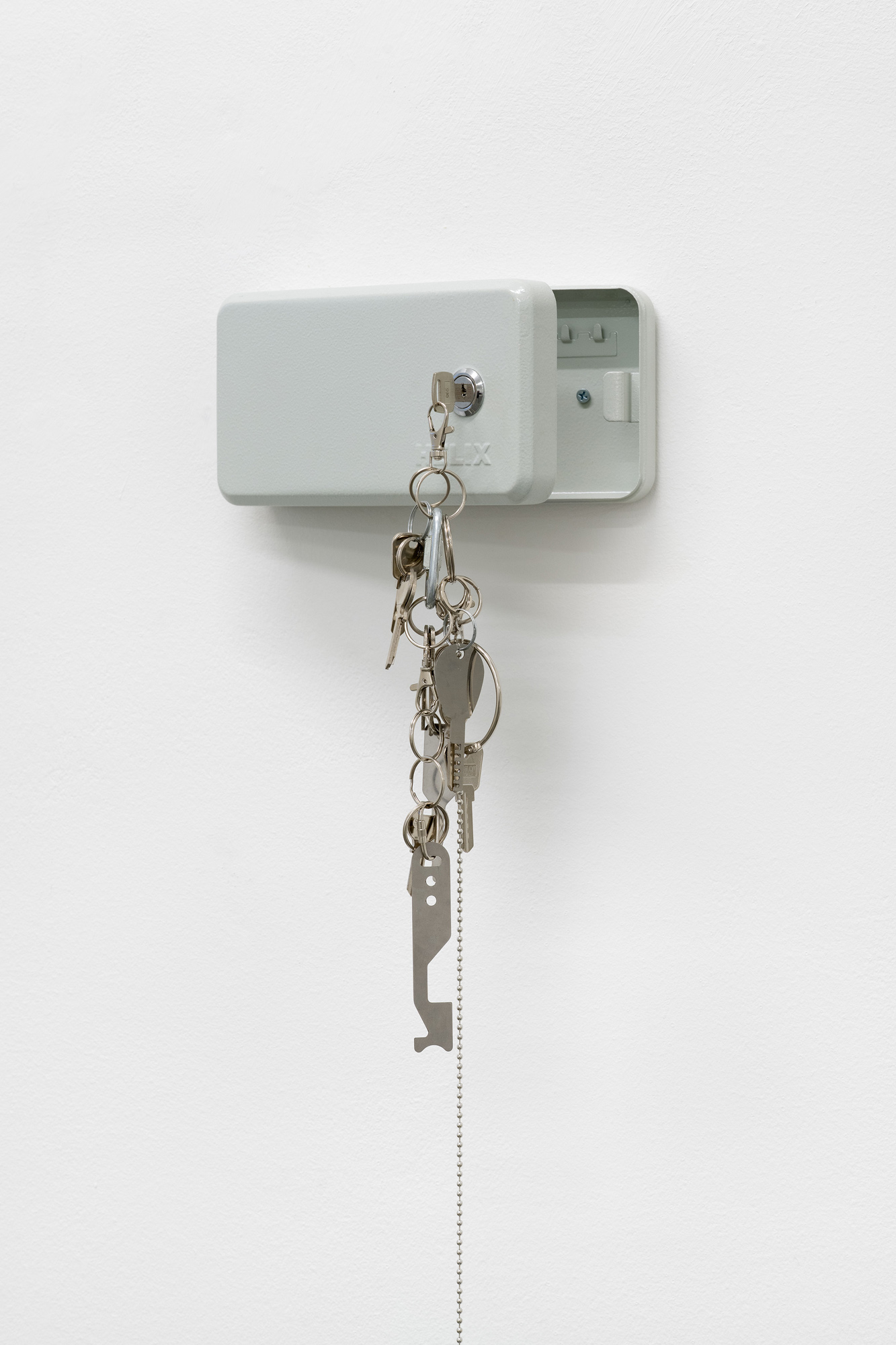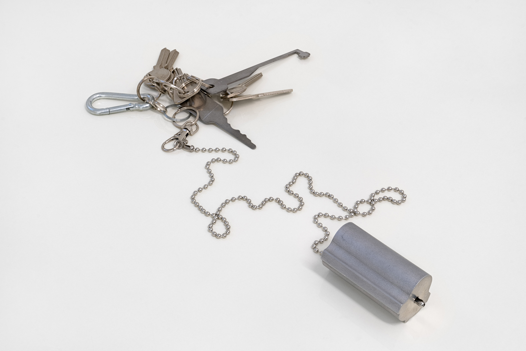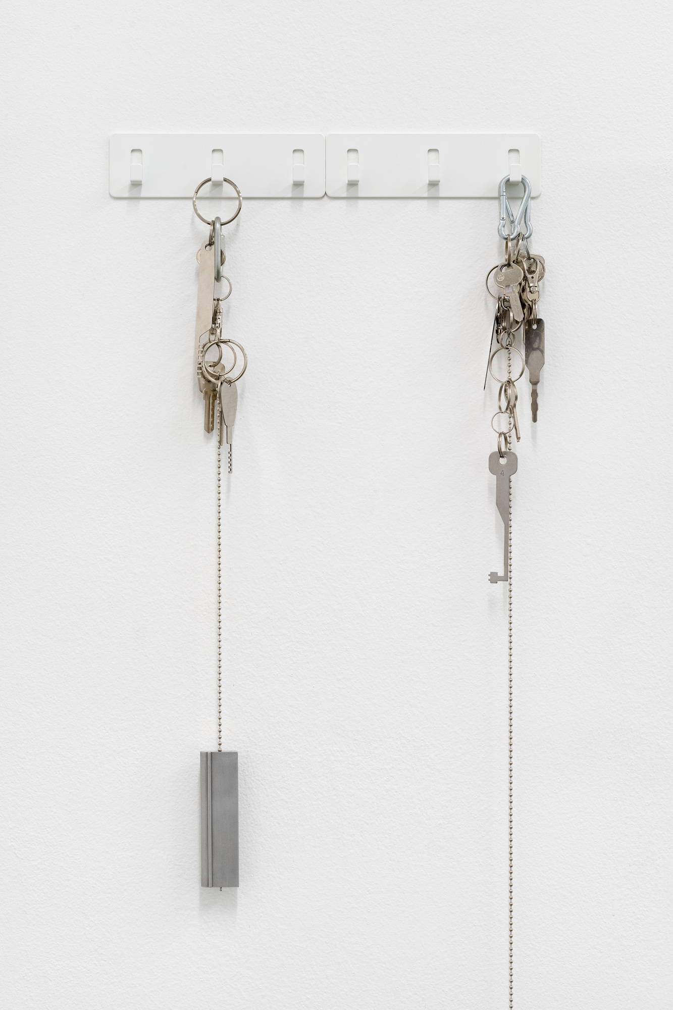 The sculptures in Kevin Hunt’s COUNSEL series borrow their form from discreet architectural details: the curved ornaments present on some of the facades of Modernist buildings constructed in England after the Second World War. Hidden in plain sight, these reinterpreted fragments are exhibited by Kevin Hunt in an attempt to question the place of ornamentation in architectural structures, and subsequently, the place of the margin in normative cities. In resonance with this series, Kevin Hunt also presents Lowkey, sculpture-keyrings whose forms echo those of the outdoor swimming pool and cinema planned for the town of Speke, on the outskirts of Liverpool—where the artist grew up—but never built. The abandoned construction of these leisure facilities, as well as a hospital, highlights the shift from a utopian project for an autonomous peripheral city—based on the model of garden cities—to the model of a dormitory town.