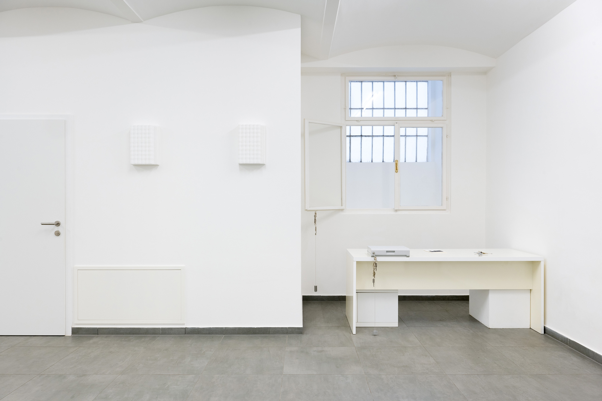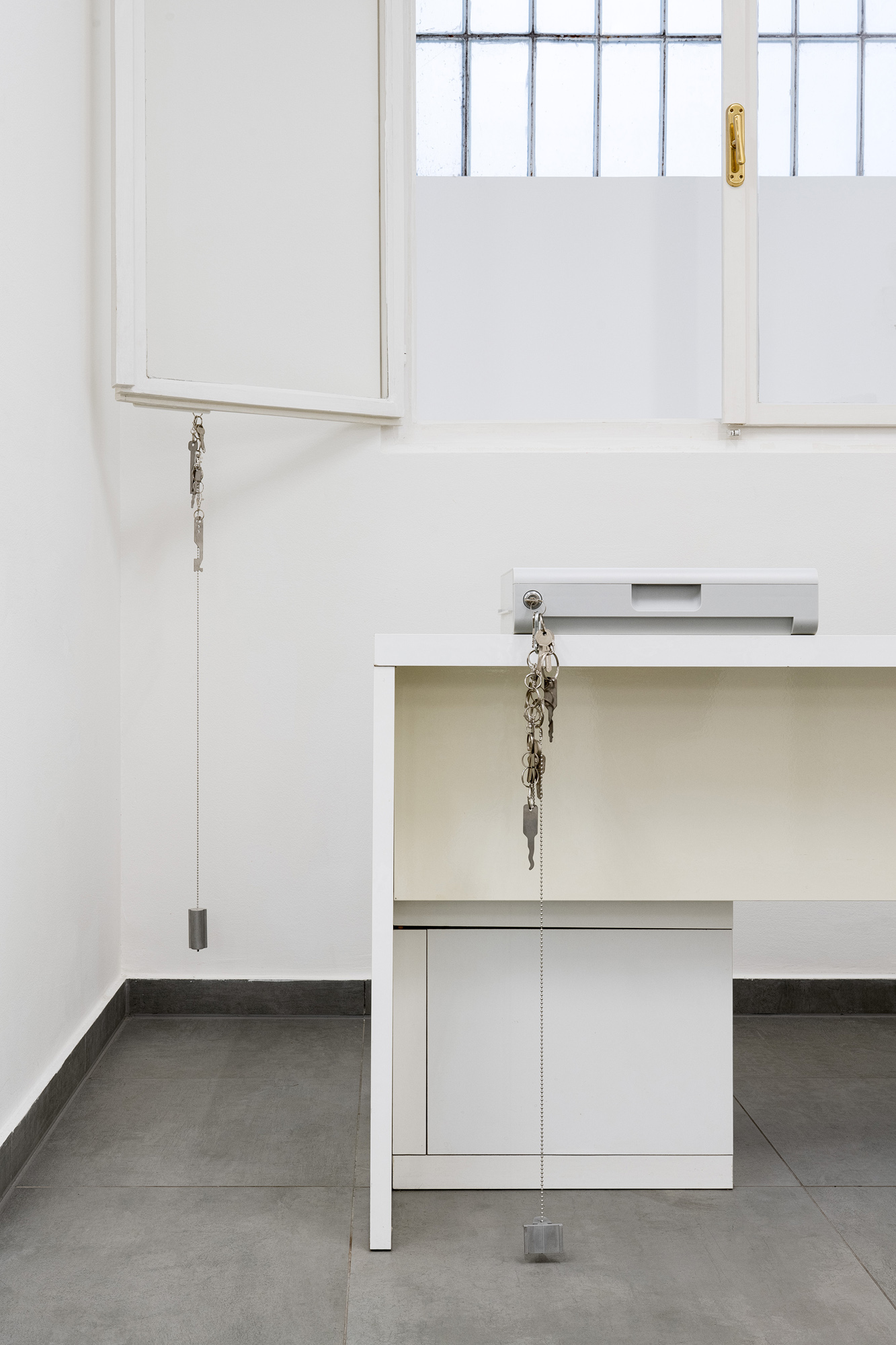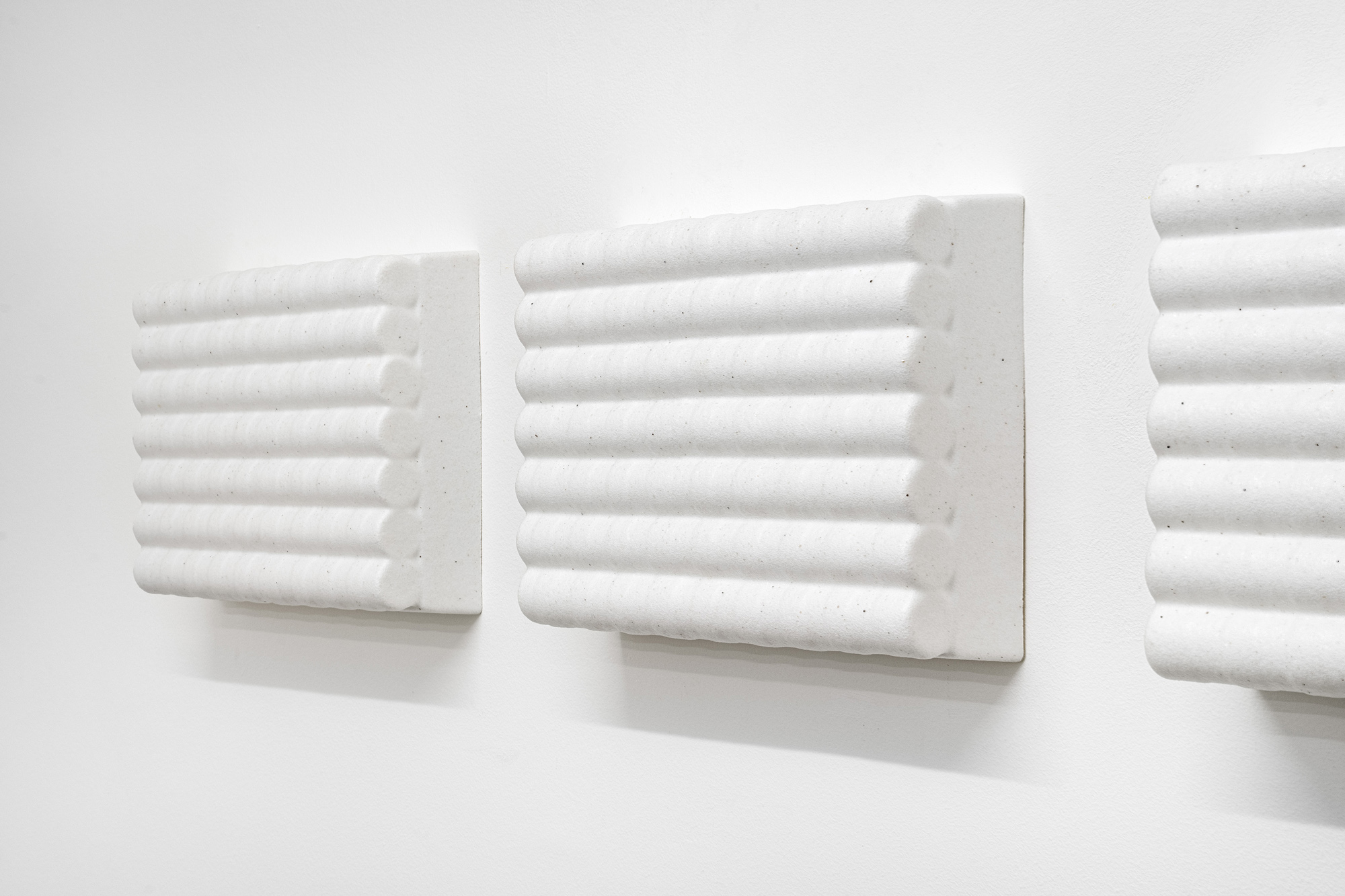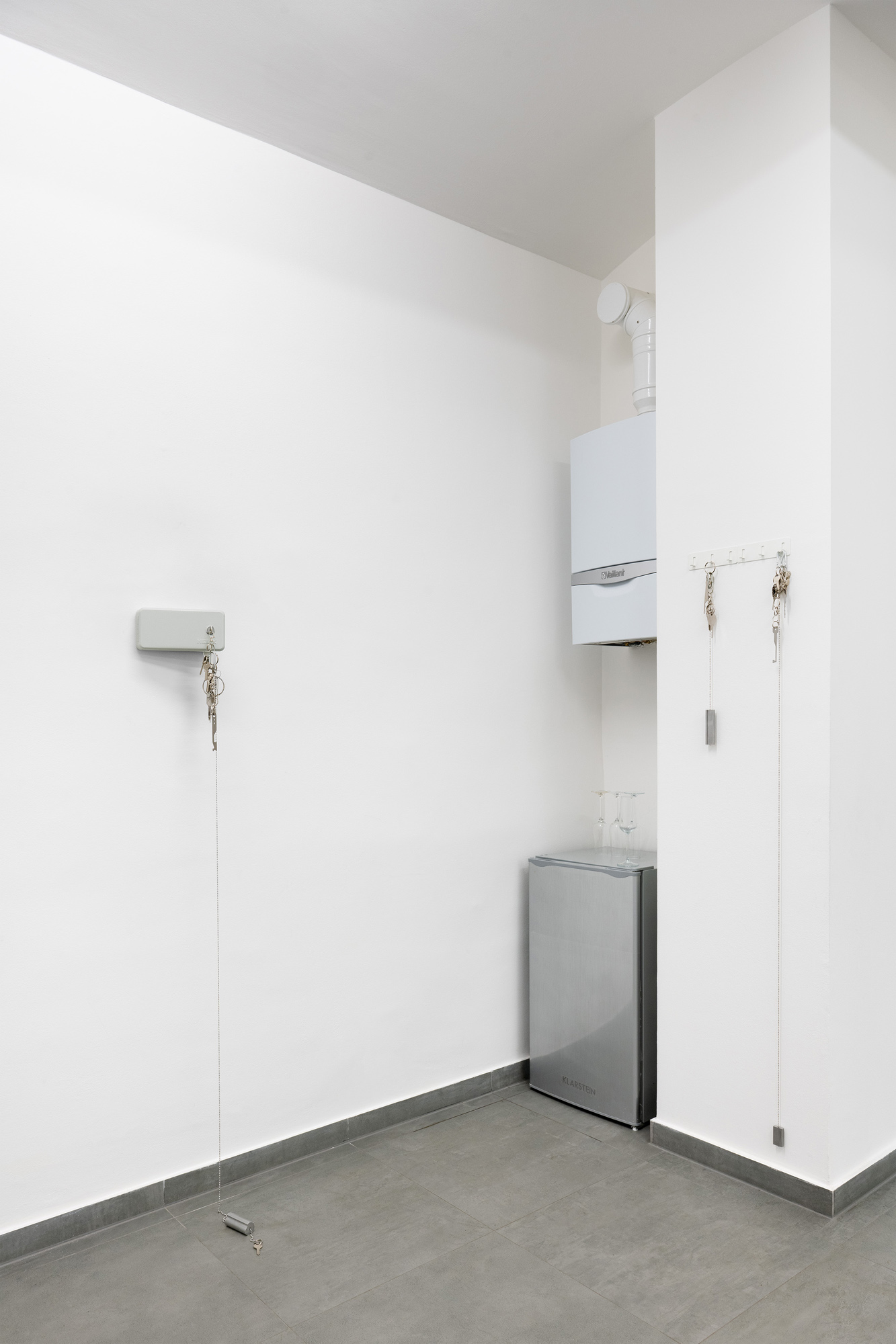 The sculptures in Kevin Hunt’s COUNSEL series borrow their form from discreet architectural details: the curved ornaments present on some of the facades of Modernist buildings constructed in England after the Second World War. Hidden in plain sight, these reinterpreted fragments are exhibited by Kevin Hunt in an attempt to question the place of ornamentation in architectural structures, and subsequently, the place of the margin in normative cities. In resonance with this series, Kevin Hunt also presents Lowkey, sculpture-keyrings whose forms echo those of the outdoor swimming pool and cinema planned for the town of Speke, on the outskirts of Liverpool—where the artist grew up—but never built. The abandoned construction of these leisure facilities, as well as a hospital, highlights the shift from a utopian project for an autonomous peripheral city—based on the model of garden cities—to the model of a dormitory town.