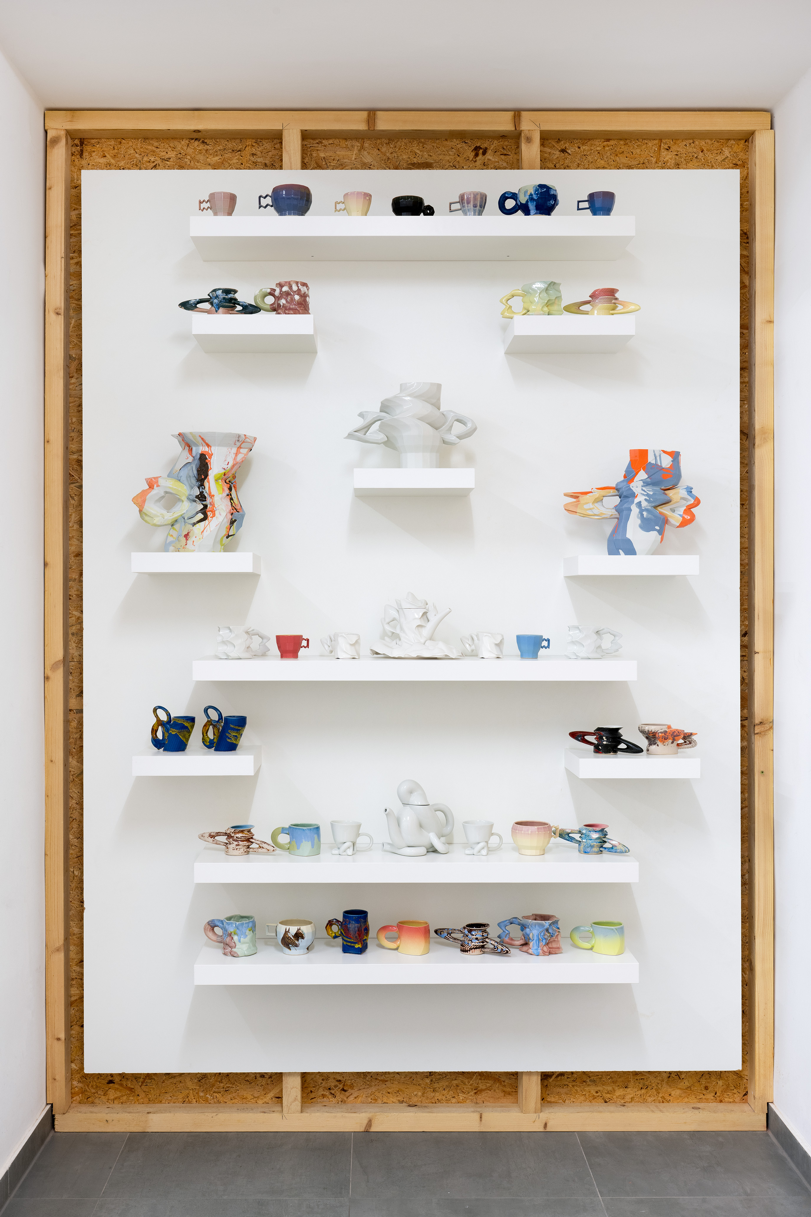 Octave Rimbert-Rivière MoreOctave Rimbert-Rivière cherishes matter. He worships it and coaxes it, flattering it as one caresses the flank of an animal that is gradually domesticated. Tenderly, he cultivates a fleshly relationship with it. And his growing interest in digital potential does not in any way virtualize his practice, which remains fiercely anchored in the tangible. It remains touching. It marries pottery and new technologies. For him, any creation is the product of collages. His clay is drawn from the depths of the dark web, and is smeared with fun, by hand. If the sculptor regularly visits the digital world — and we cannot insist enough on the tactile dimension of the term ‘digital’ — it is to experiment with the modelling that such a tool allows, as would a potter’s rib. The computer is a vector of distortion, a machine to hack an archetypal form. The artist transforms the glitch into porcelain, pouring electronic flux and liquid clay into molds. In turn, his mugs and teapots both contain and spill. The glazes ooze, crackle, split. They bubble too. There is no limit to the amount of crust they can produce, because in ceramics, it’s always firing. From this angry magma, it is a question of creating functional objects, which are truly useful. This unblocks them from the exhibition space, and after having exported them a first time from the screen, frees them even more to simply irrigate life, in a race towards the concrete. To escape plinths, to crack the codes, to break the boxes. The function liberates the work. Joël Riff, december 2022