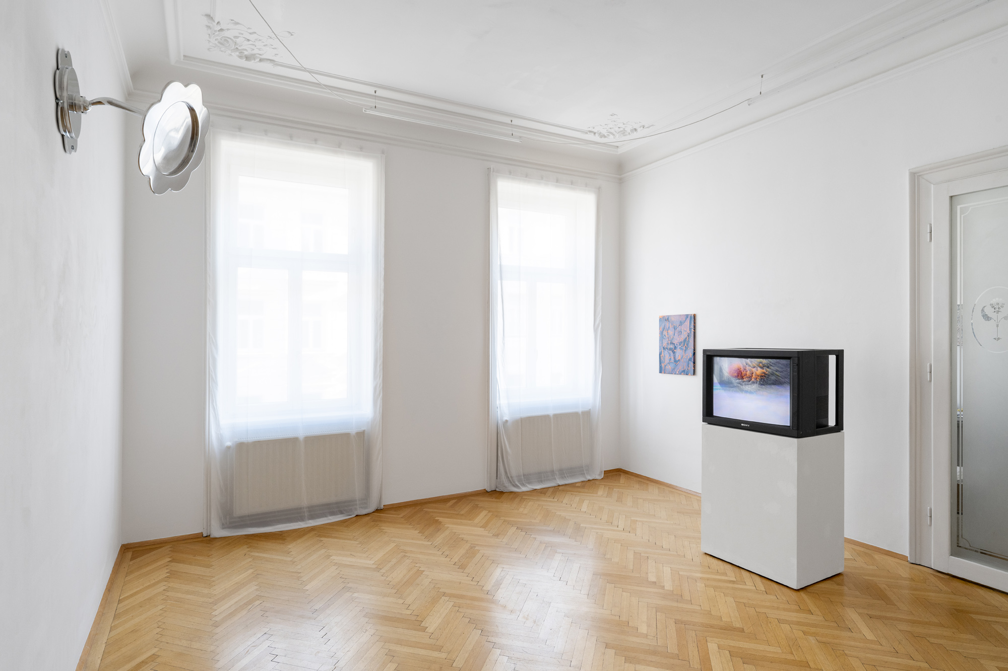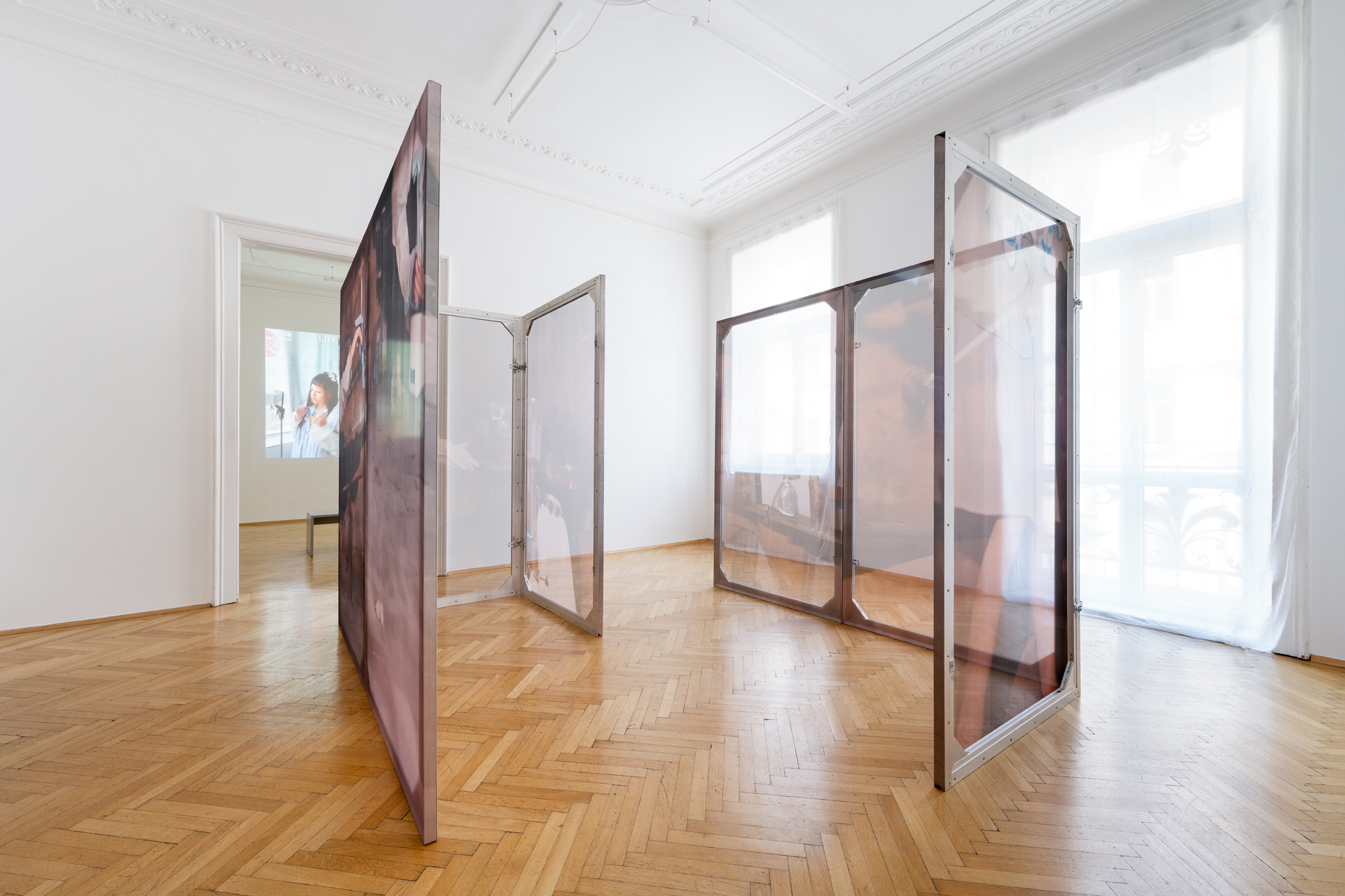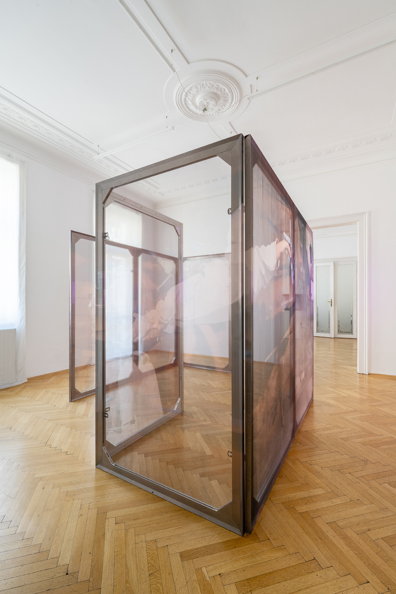 Like a scrutinising gaze pointed at us, the work Yield II (2021) by Dorota Gawęda and Eglė Kulbokaitė reactivates a common and popular object in Eastern Europe: a flower-shaped cosmetic mirror, also secretly used during puberty to discover one’s body. The artists’ practice inscribes itself in speculative and post-digital aesthetics, merging organic and synthetic forms. Their freestanding metal structures, Enclosures I-VII (2023-2024), resemble screens, filters or folding paravents. Drawing on Slavic folk mythologies, they summon the beliefs of “field workers” into a hyper-technological world. The resulting images, generated from digital prompts and performance documentation, appear ghostly, hallucinatory and mutable.